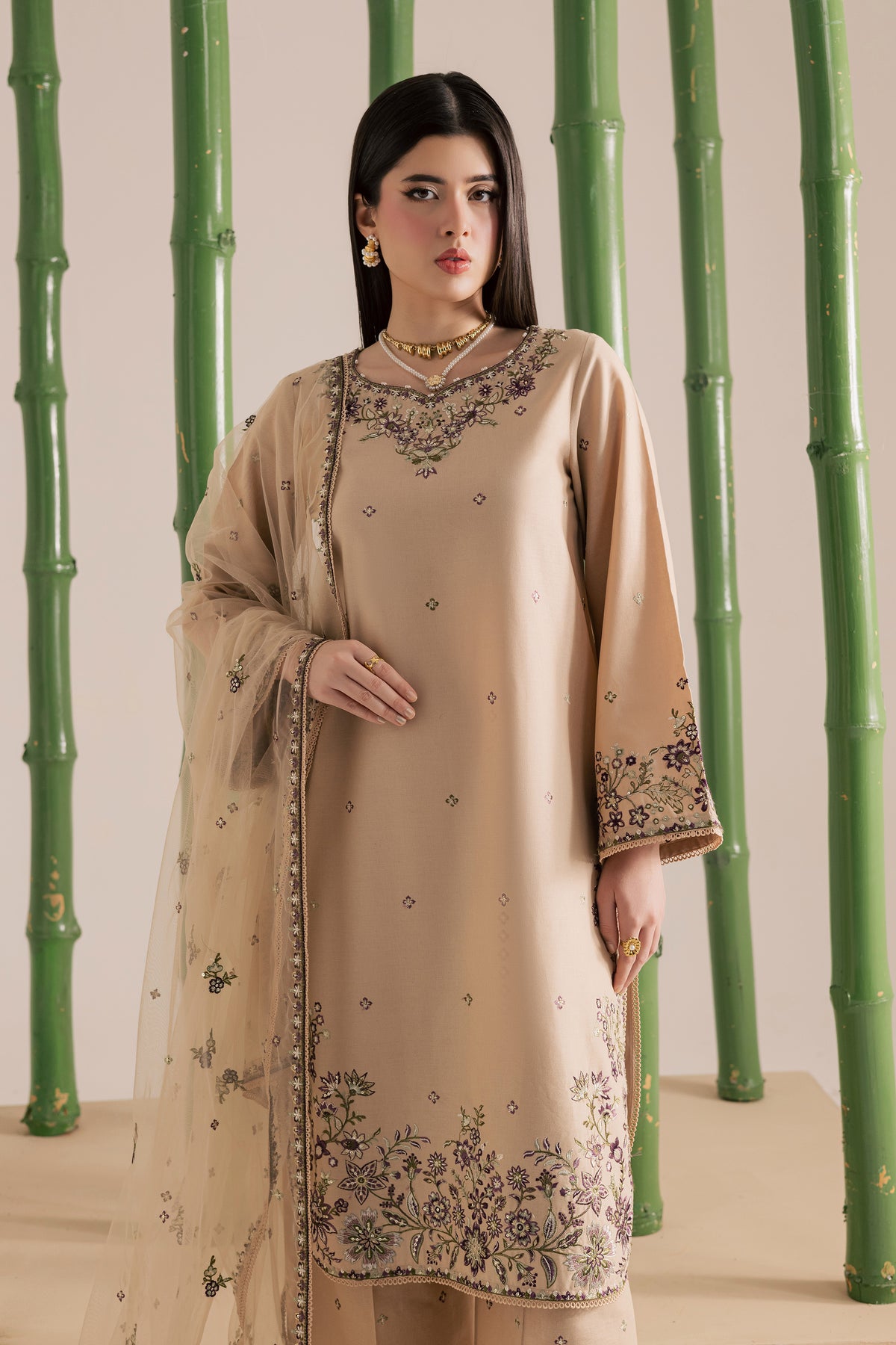 This beige three piece khaddar ensemble features a mid length shirt with a round hem, composed embroidered detailing on the neckline and hem, and a soft embroidery spread across the front. The flared sleeves are finished with embroidered borders and a matching spread, while crystals at the neckline add a subtle festive sparkle. Both the shirt hem and sleeves are finished with self crochet lace.