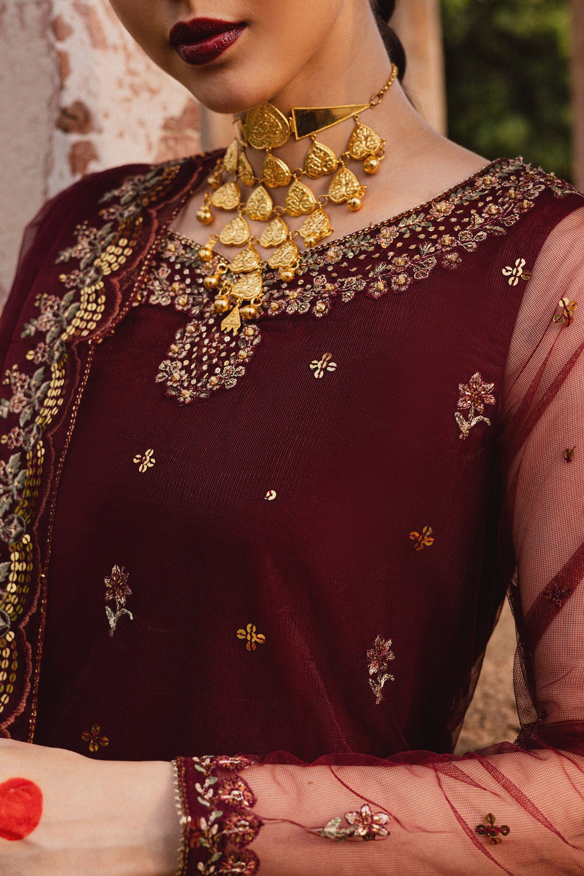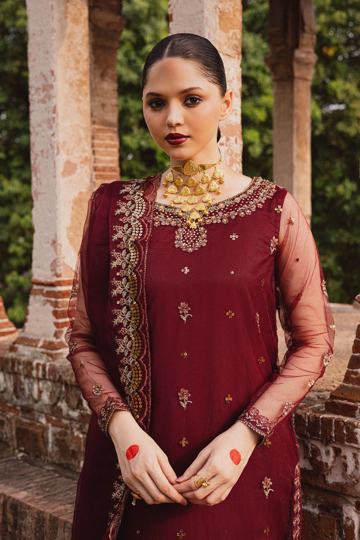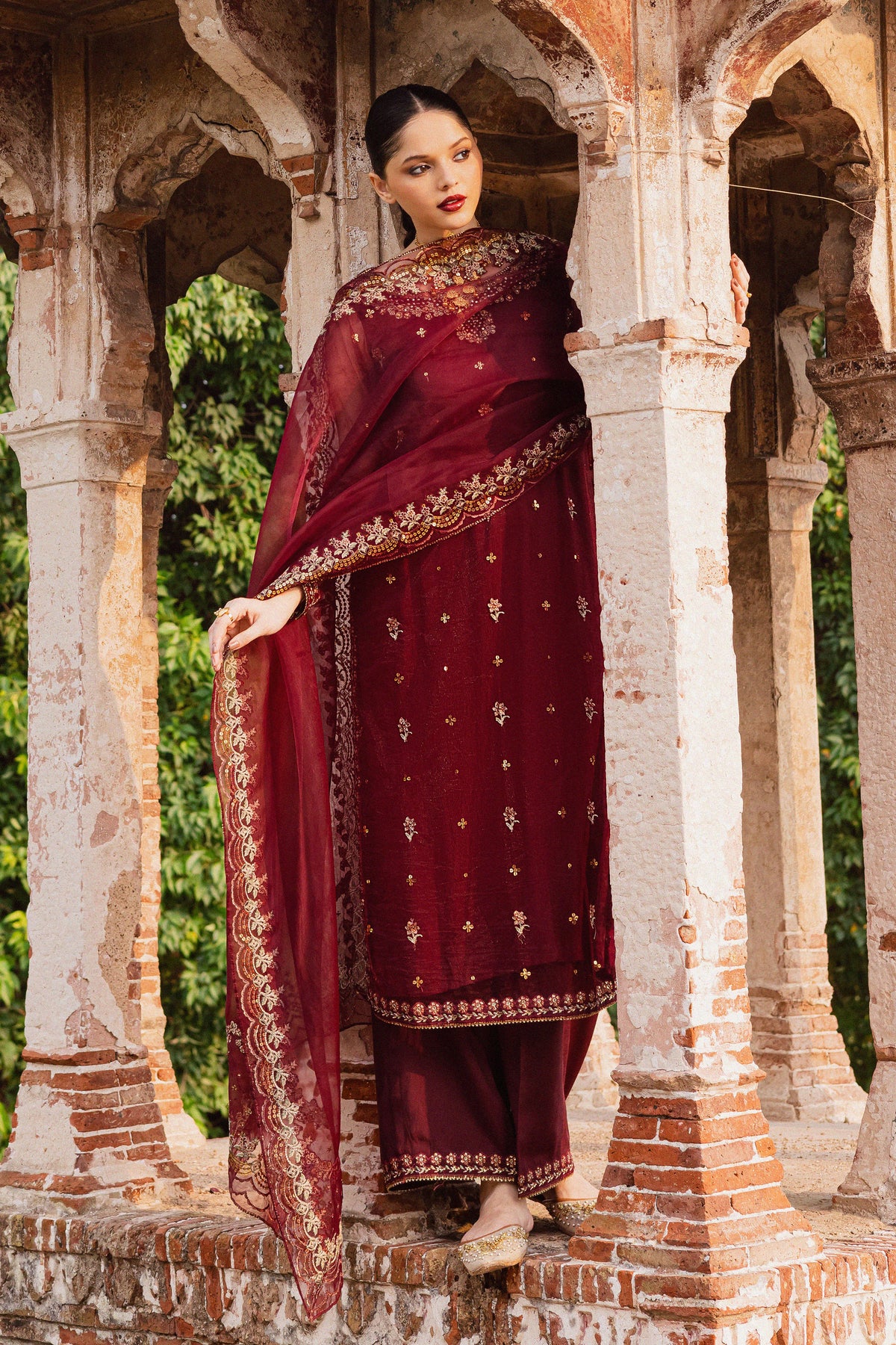 Make a statement with this graceful three-piece set featuring a maroon net embroidered shirt with borders on three sides. The sleeves are embroidered and finished with a delicate hem border and samosa lace for a refined touch.