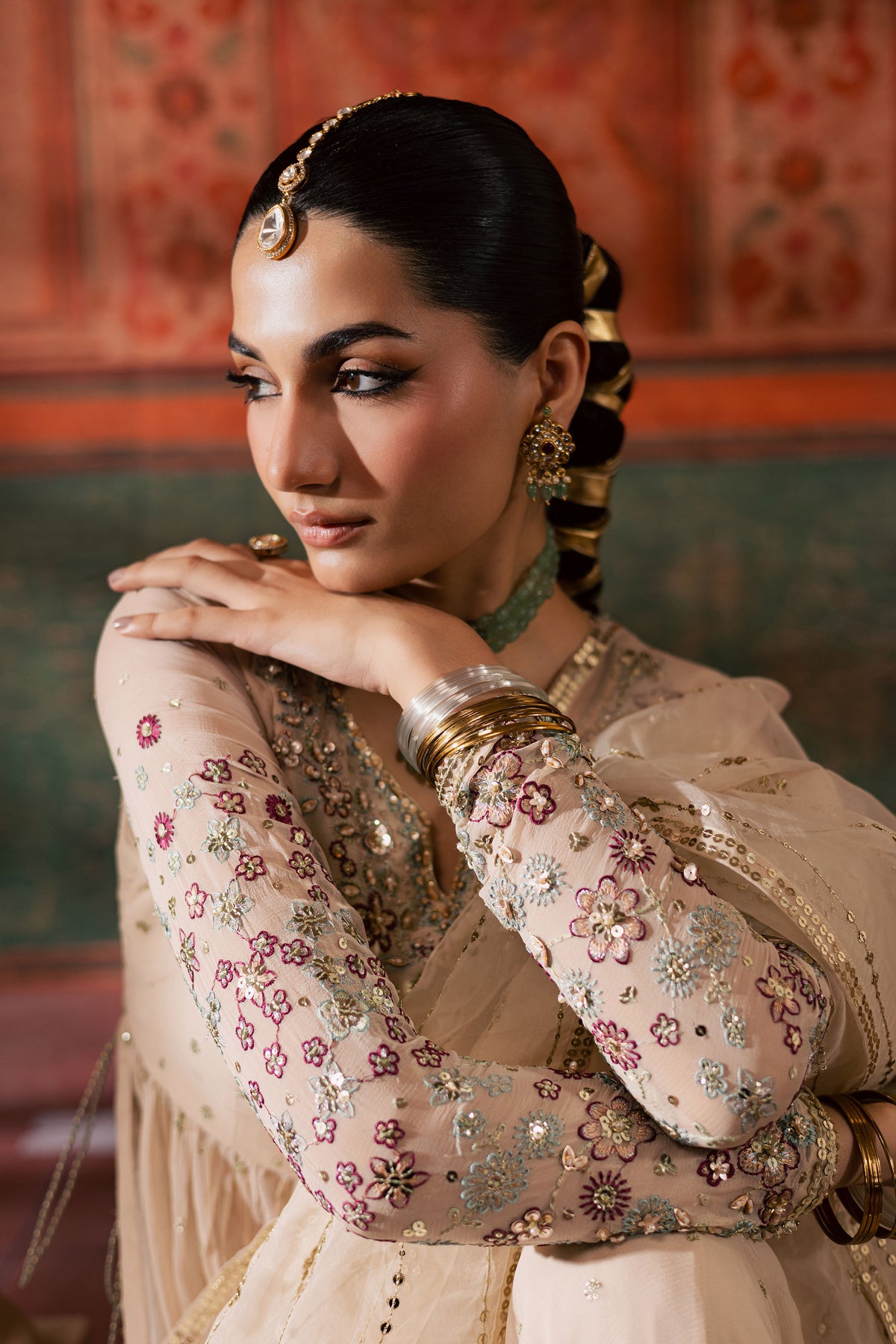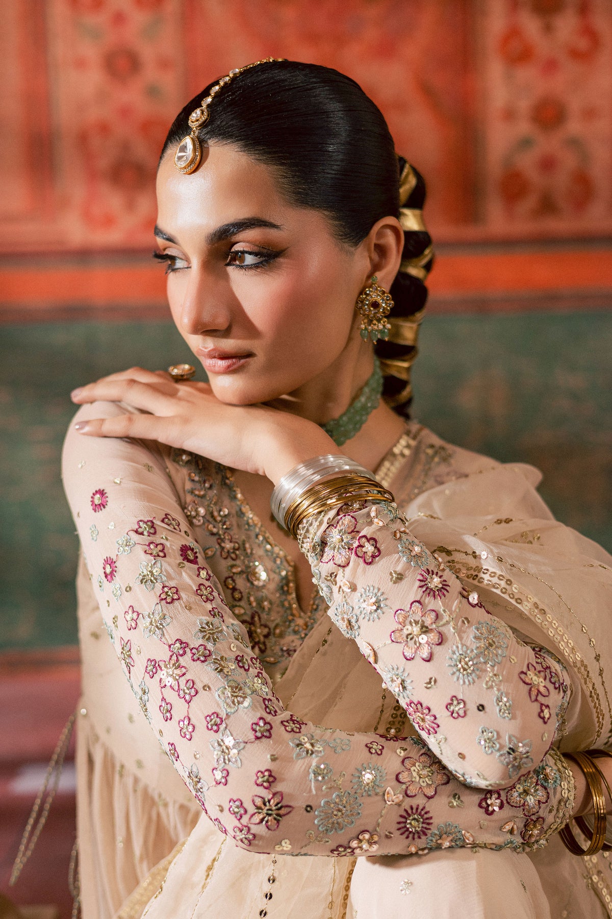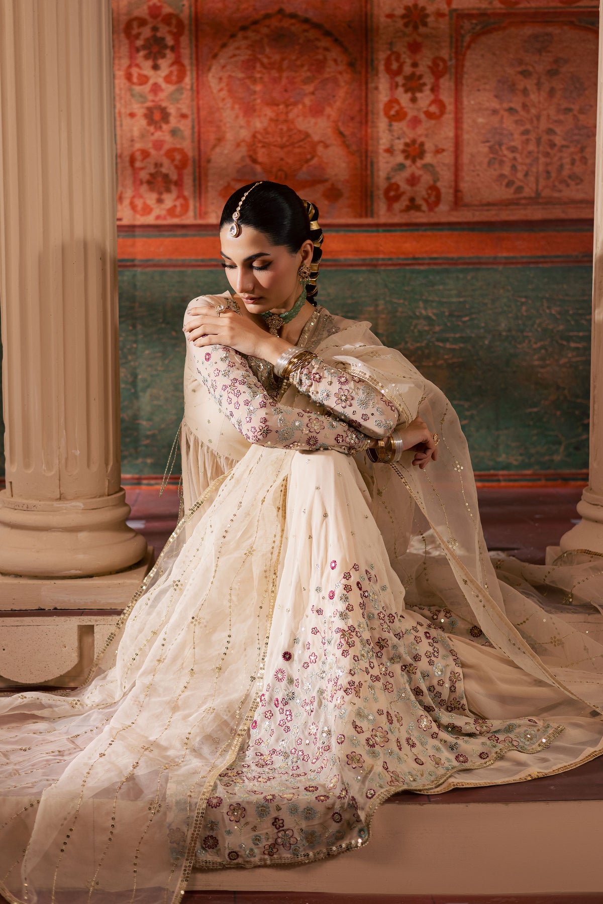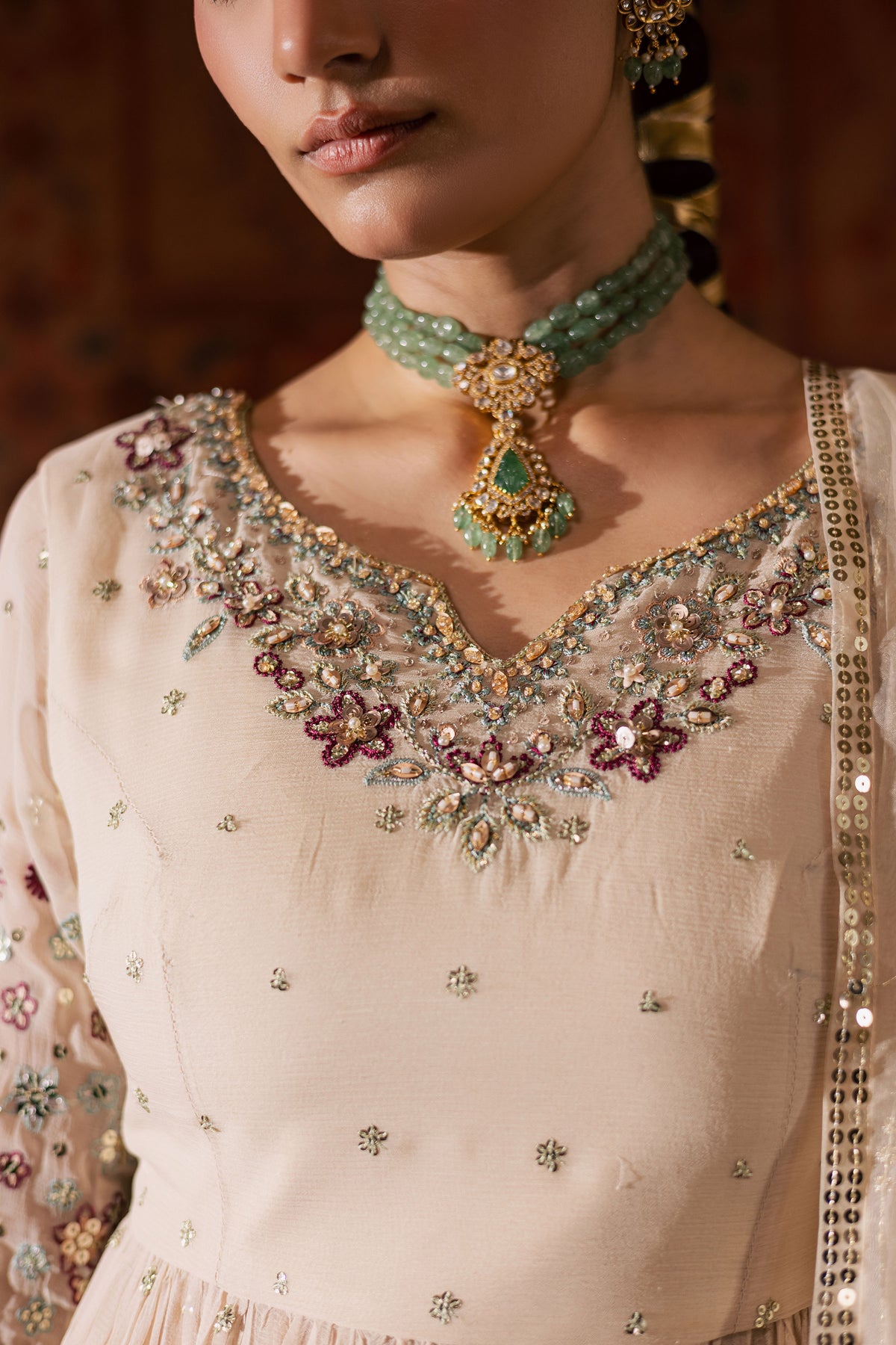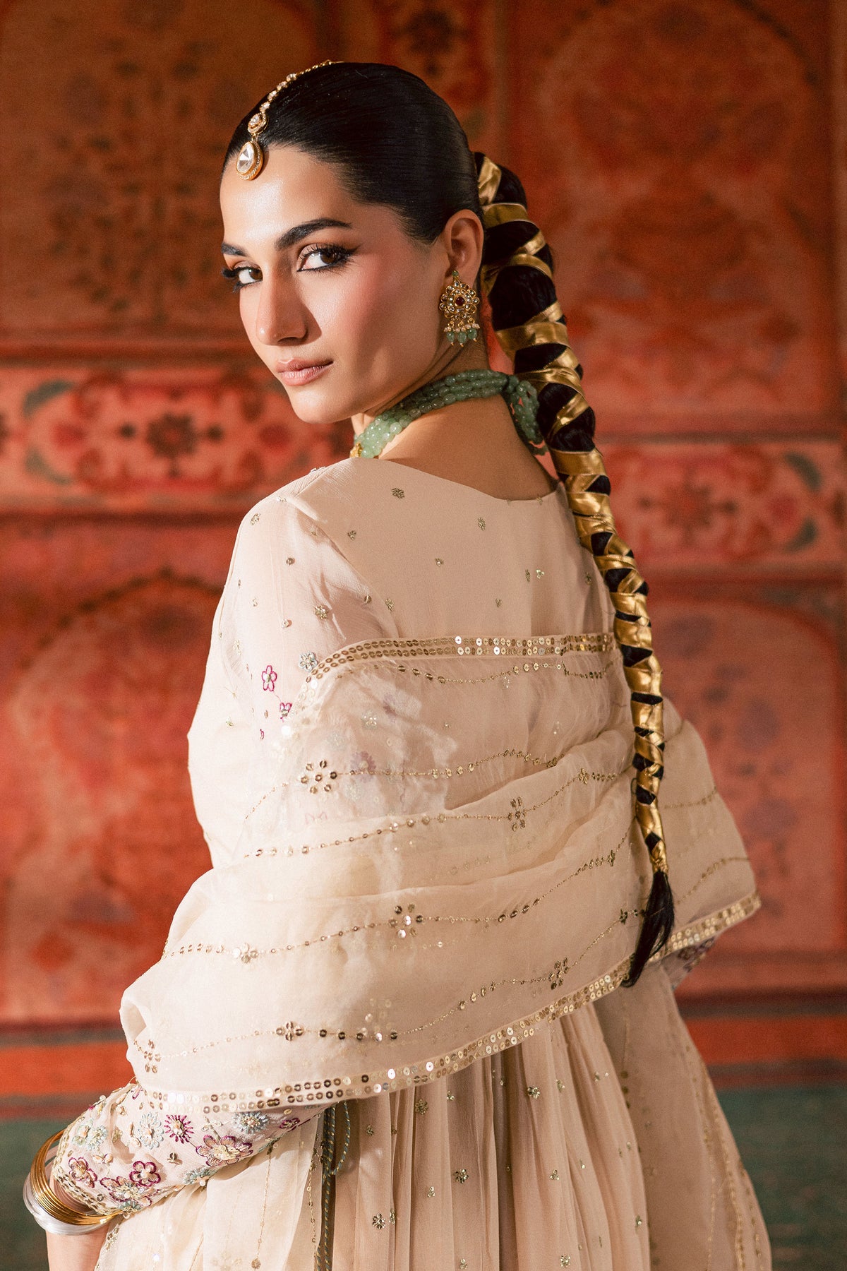 An organza dupatta completes the ensemble, detailed with embroidery and embellished lace on all four sides. Its soft flow and subtle shine enhance the outfit’s overall elegance, adding the perfect finishing touch to a timeless design.