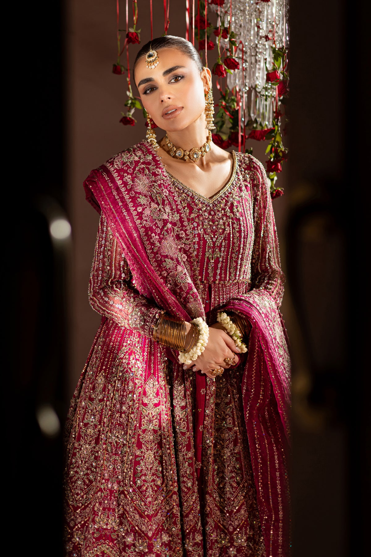This resplendent front open frock, crafted from luxurious raw silk, is heavily embroidered and lavishly adorned with detailed adda work. The sleeves are richly embroidered and finished with organza borders at the hem, further enhanced with lace finishing and delicate hangings for a graceful touch. The frock’s hemline is crowned with a wide, heavily embroidered organza border, while additional hangings create fluid movement and depth. At the back, the yoke is elegantly designed with tassels, adding a regal flourish to the ensemble.