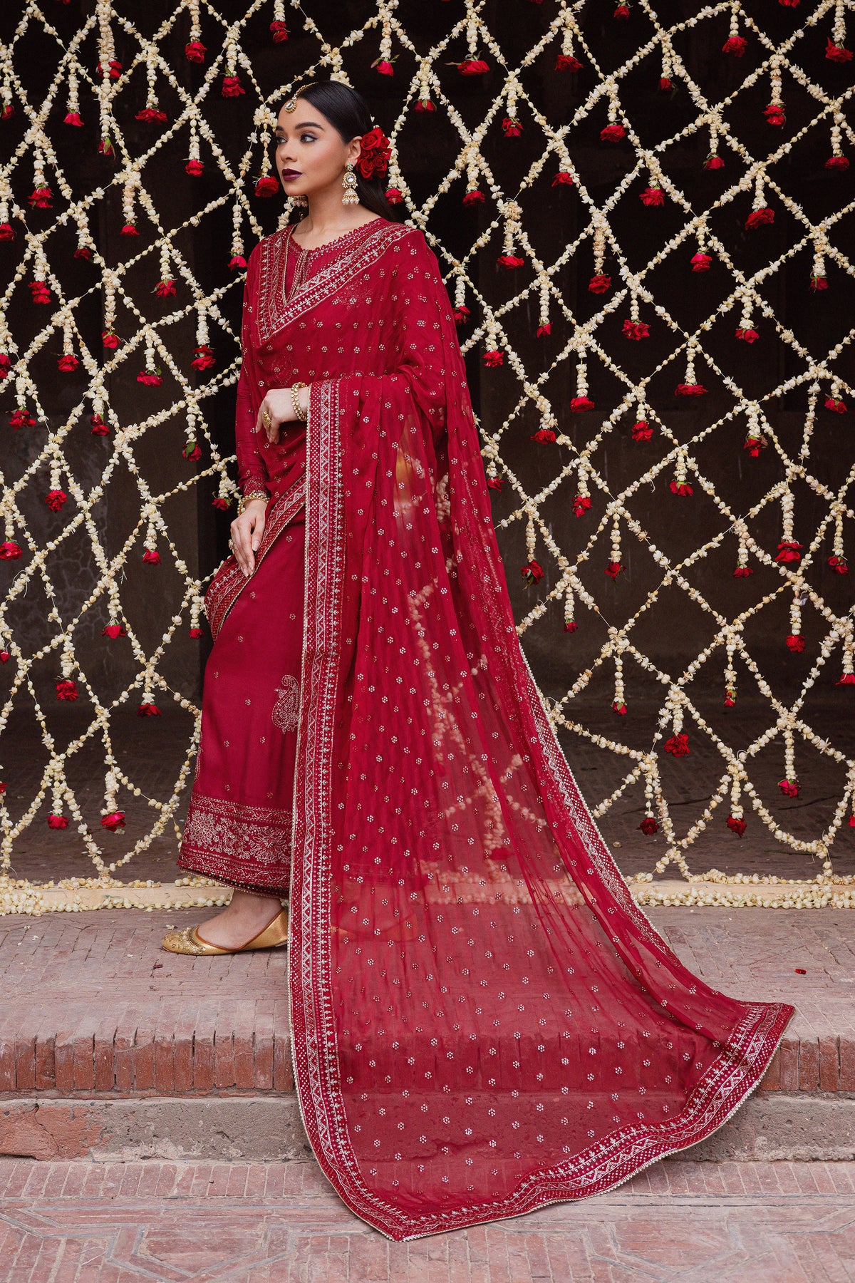 The look is completed by a beautifully embroidered chiffon dupatta, perfectly balancing the rich textures for a stunning festive ensemble.