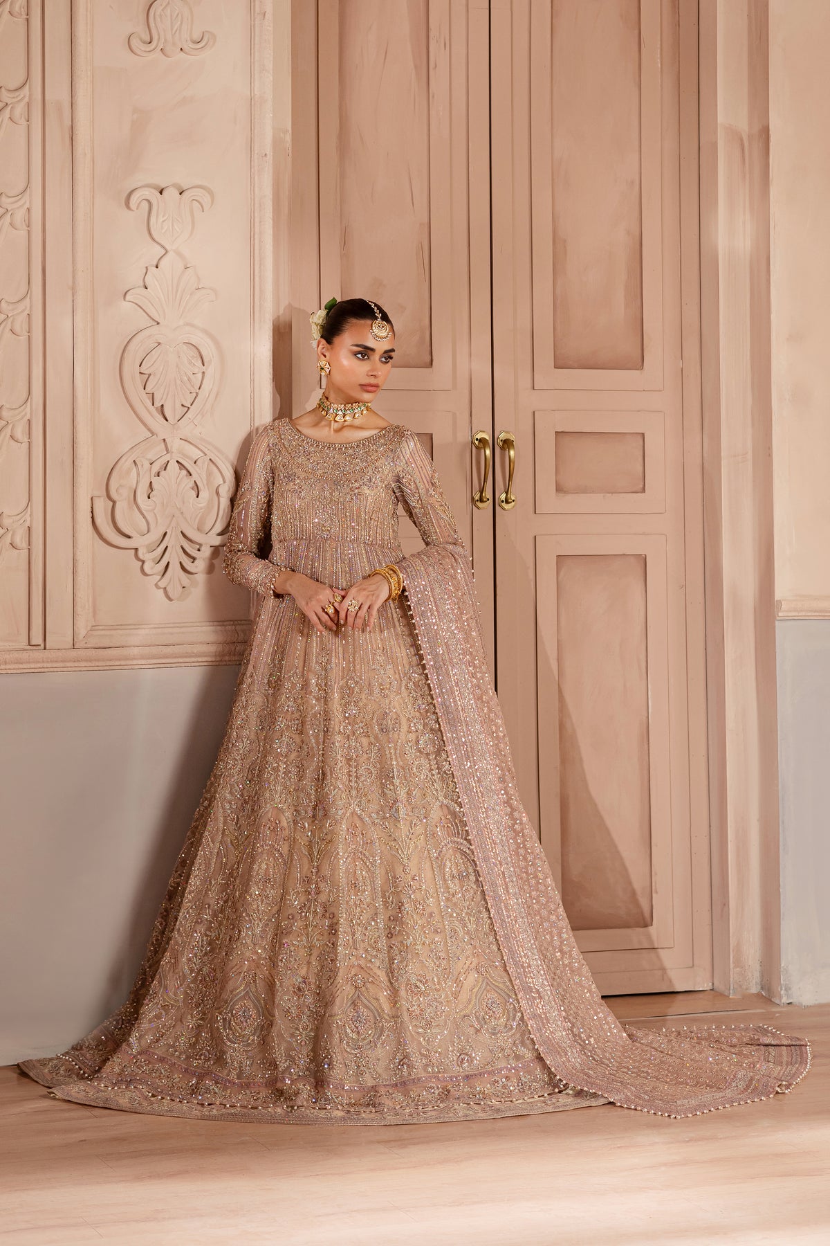 Paired with the pishwas is an inner paneled frock crafted from gold-toned tissue fabric. The frock is finished with a richly embroidered border that enhances the silhouette, while the attached can can adds volume and majestic flow. This combination creates a layered harmony of textures and tones, celebrating timeless bridal luxury.