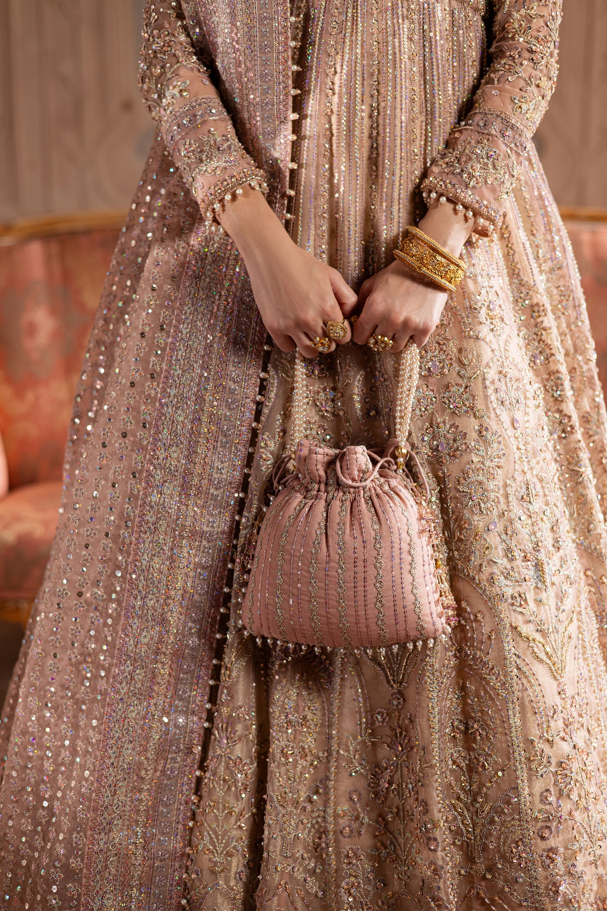 Adding the final note of refinement, an intricately embroidered pouch adorned with pearls and delicate embellishments accompanies the ensemble. It is a regal accessory designed to complement this magnificent attire.
