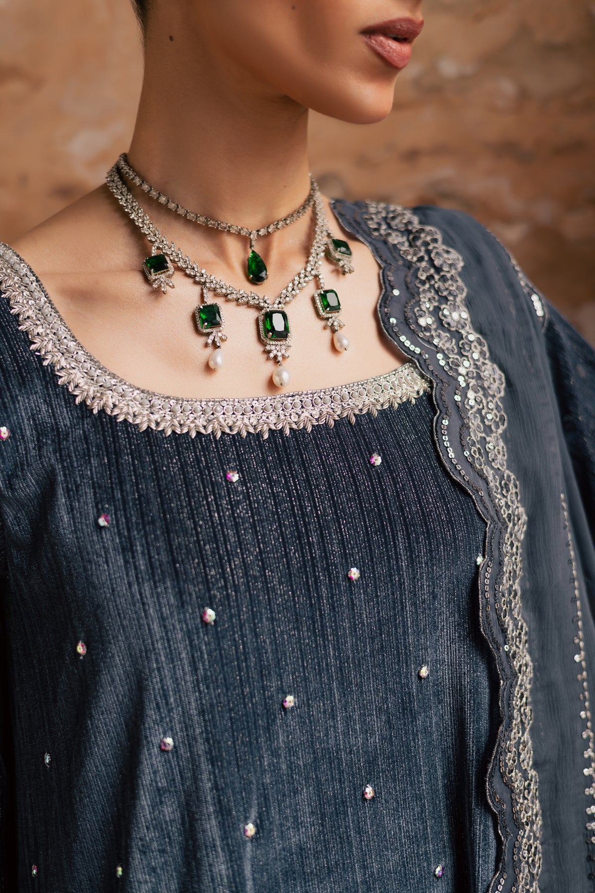 A crinkle chiffon dupatta completes the ensemble with a floral scalloped border on all four sides and a subtle sequin embellishment at the center, adding a soft finishing touch.