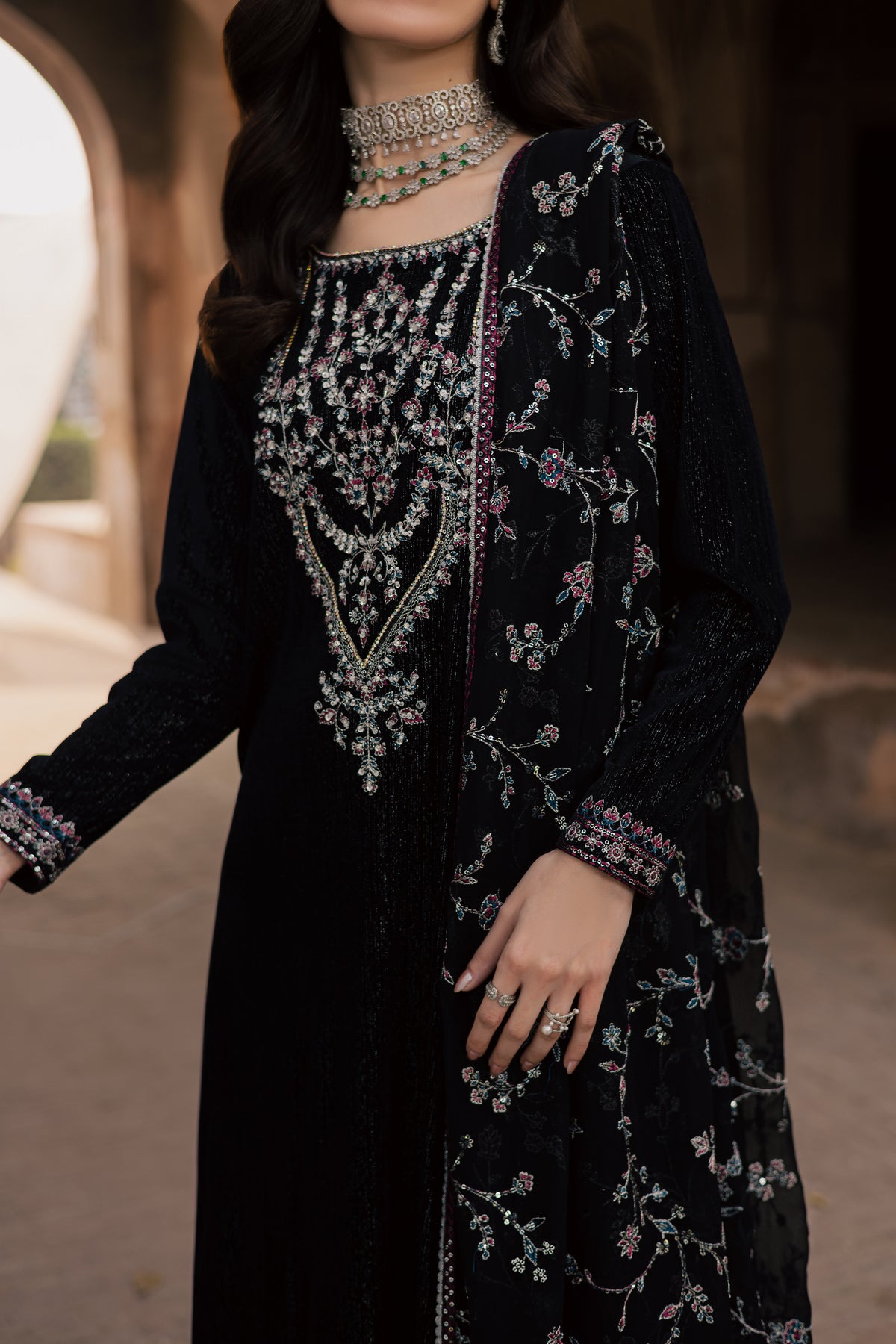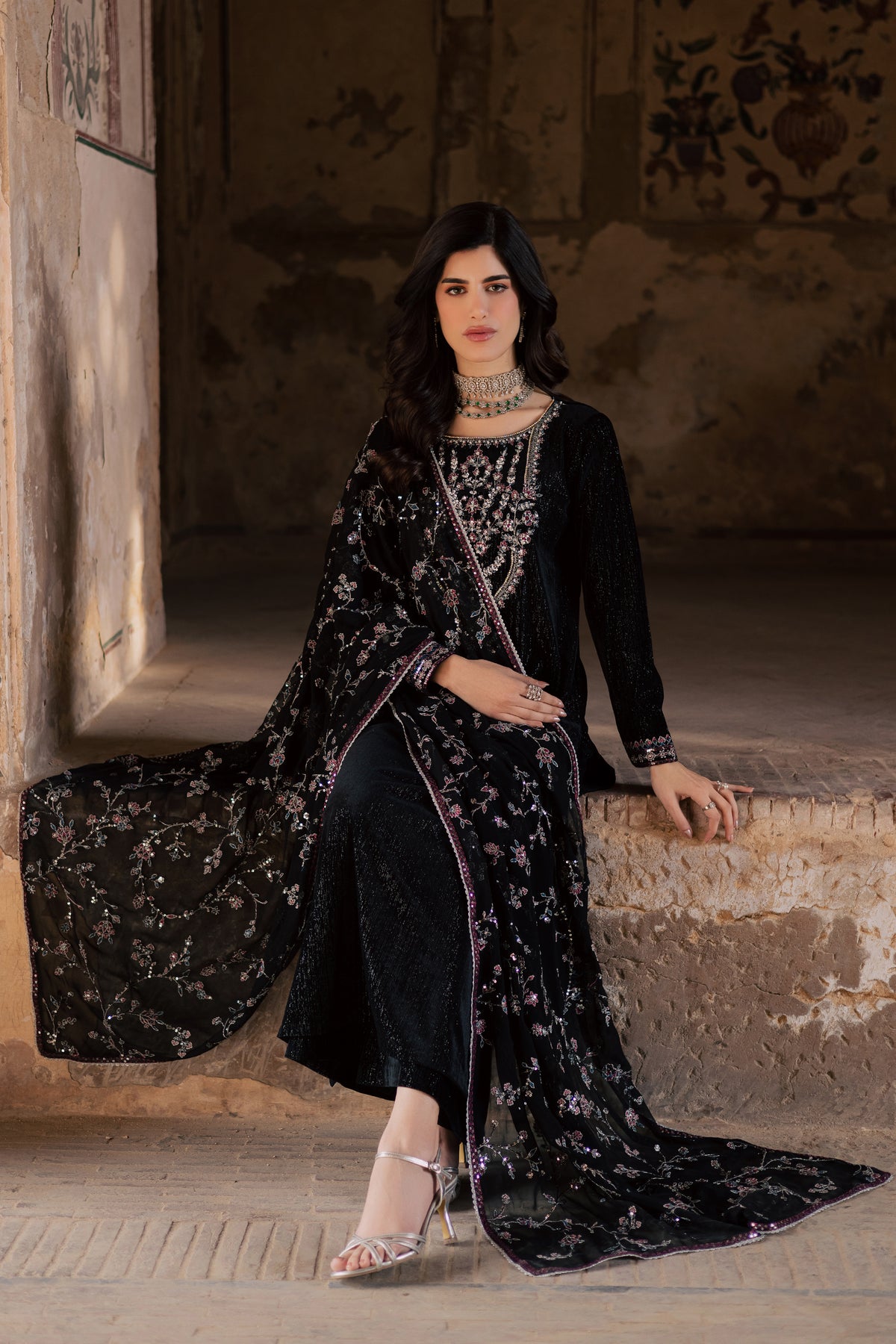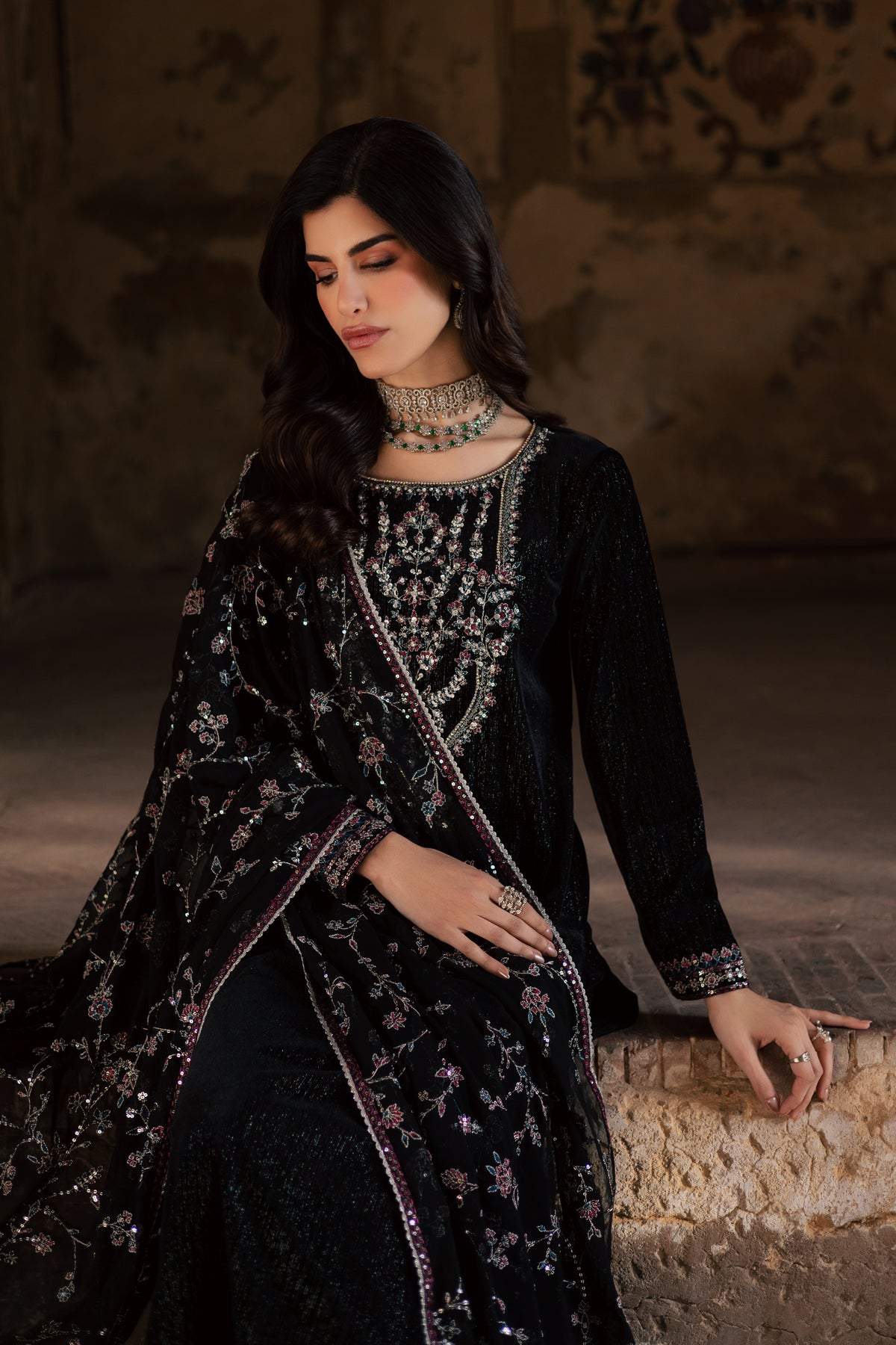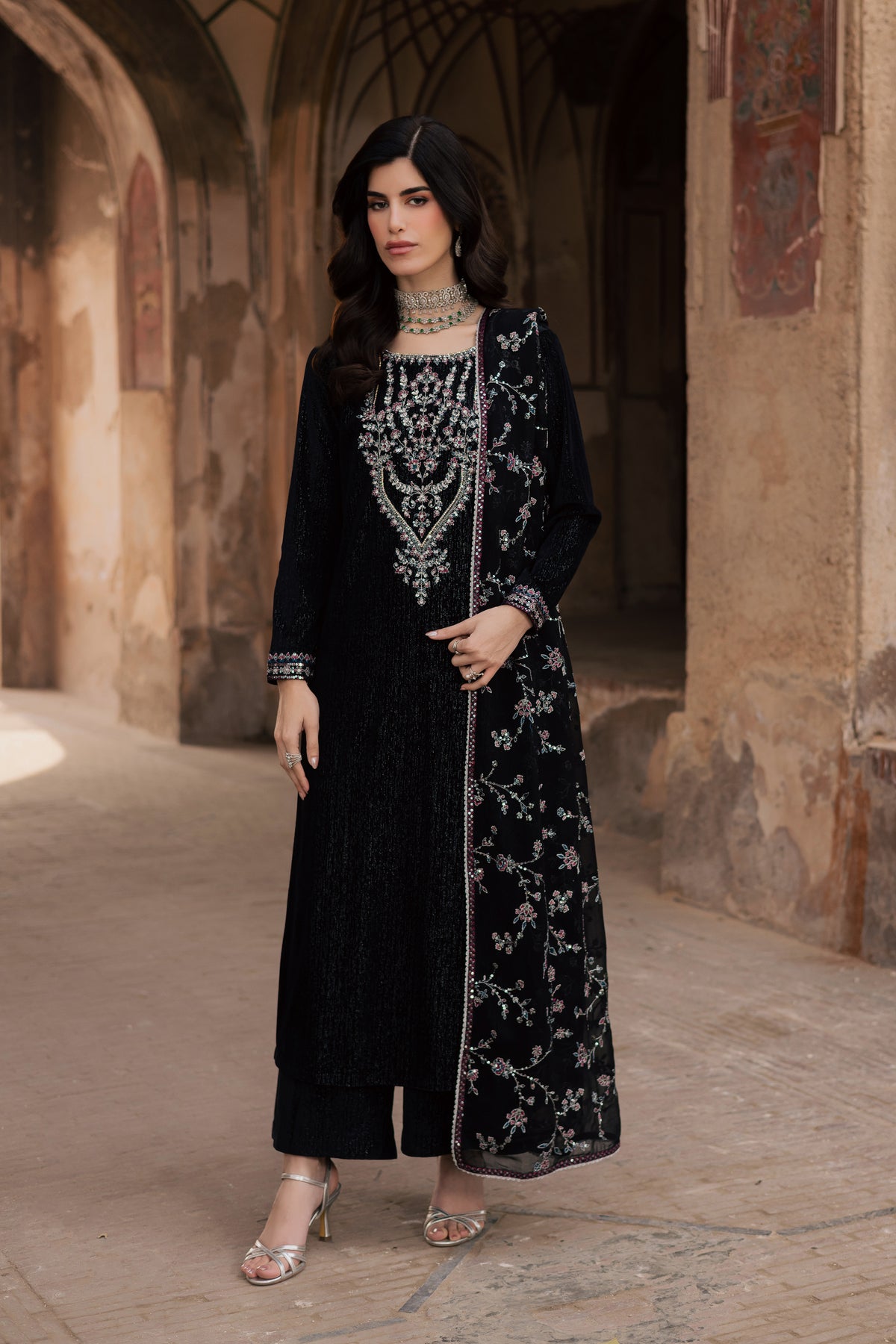This three piece black velvet set features a black textured velvet shirt with an embroidered neckline detailed with silver tilla and sequin work. The neckline is enhanced with adda work, while the sleeves are finished with embroidered borders and lace at the hem for a refined finish.