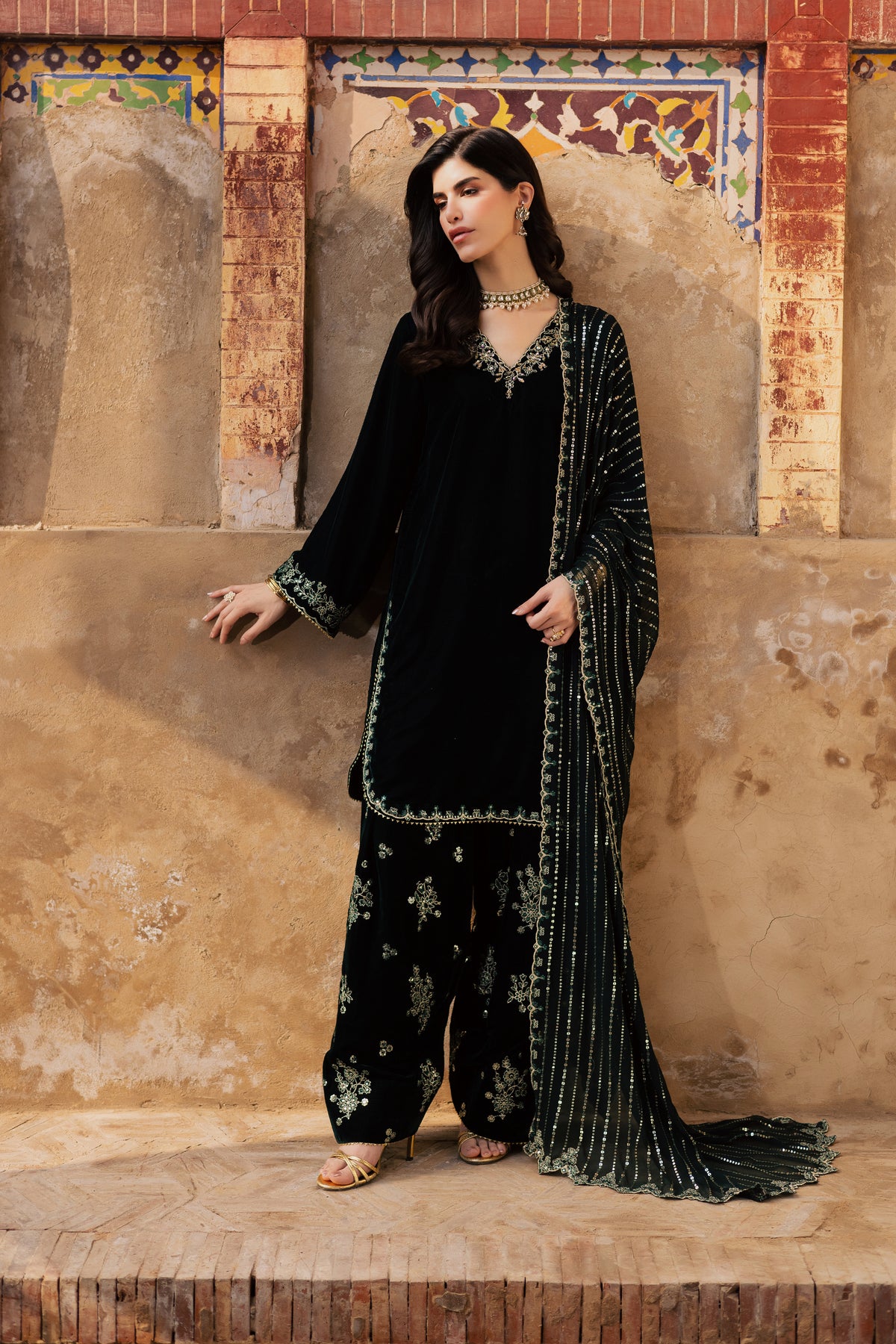 Paired with an embroidered velvet shalwar, the ensemble exudes festive opulence. The sharara is finished with samosa lace, enhancing its traditional elegance while maintaining a soft, graceful flow.