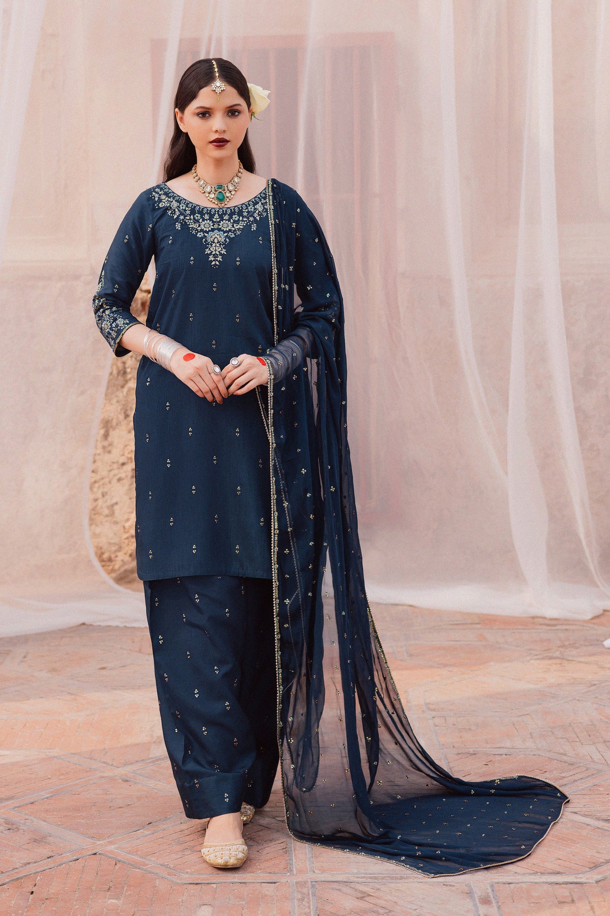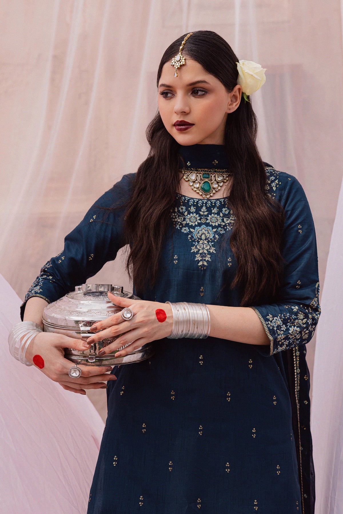 Paired with a sequin-embroidered raw silk shalwar, this set balances boldness and elegance effortlessly.