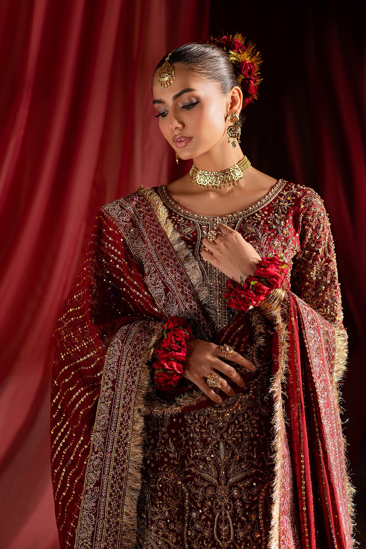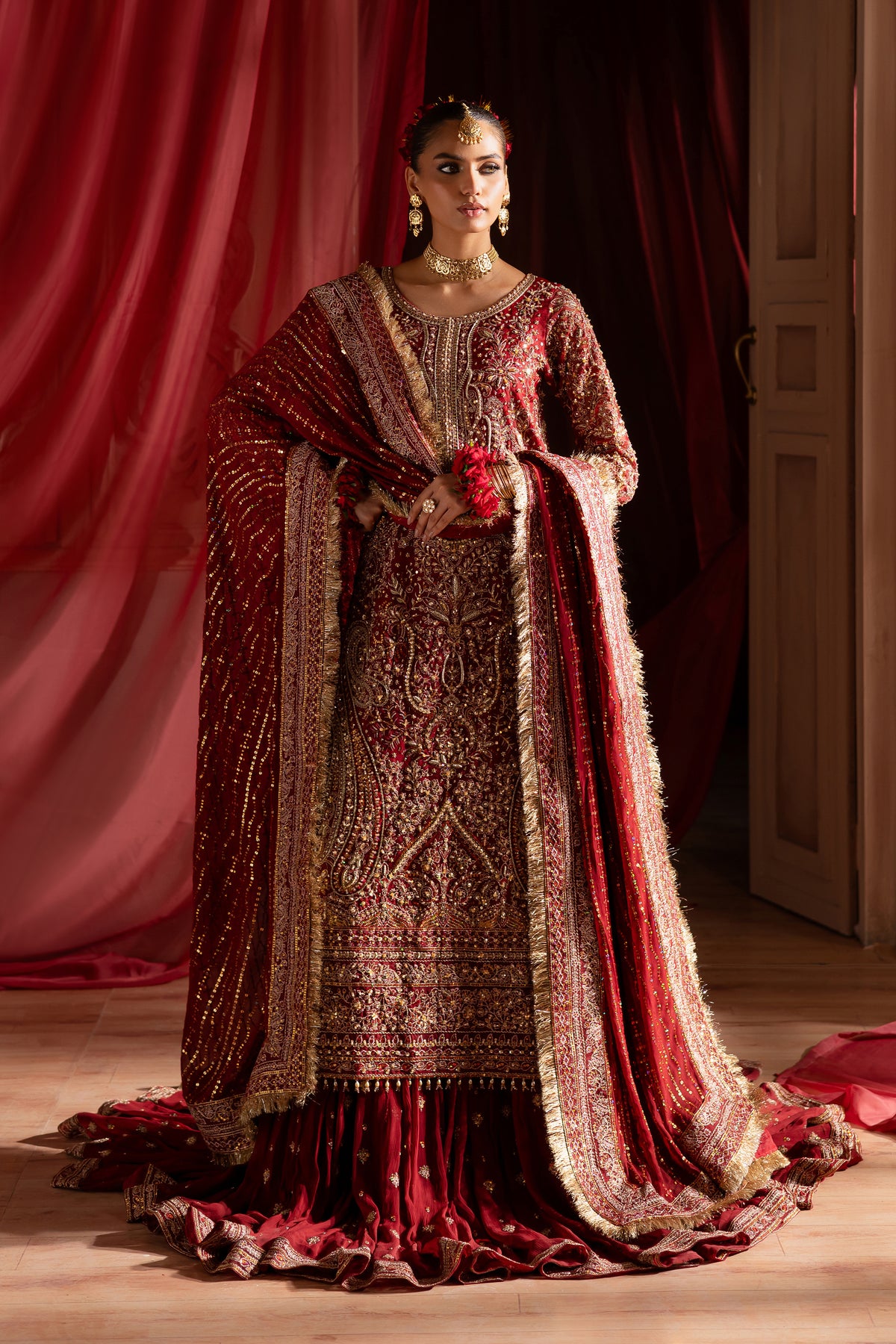 The luxurious organza shirt is a vision of intricate artistry. Heavily embroidered across the front, back, and sleeves, it is further enriched with elaborate handwork featuring resham, dabka, naqshi, sequins, and crystals. Each motif is thoughtfully placed to create a symphony of elegance. The shirt is finished with delicate ornamental hangings at the neckline and sleeve hems, adding graceful movement and a hint of bridal opulence.