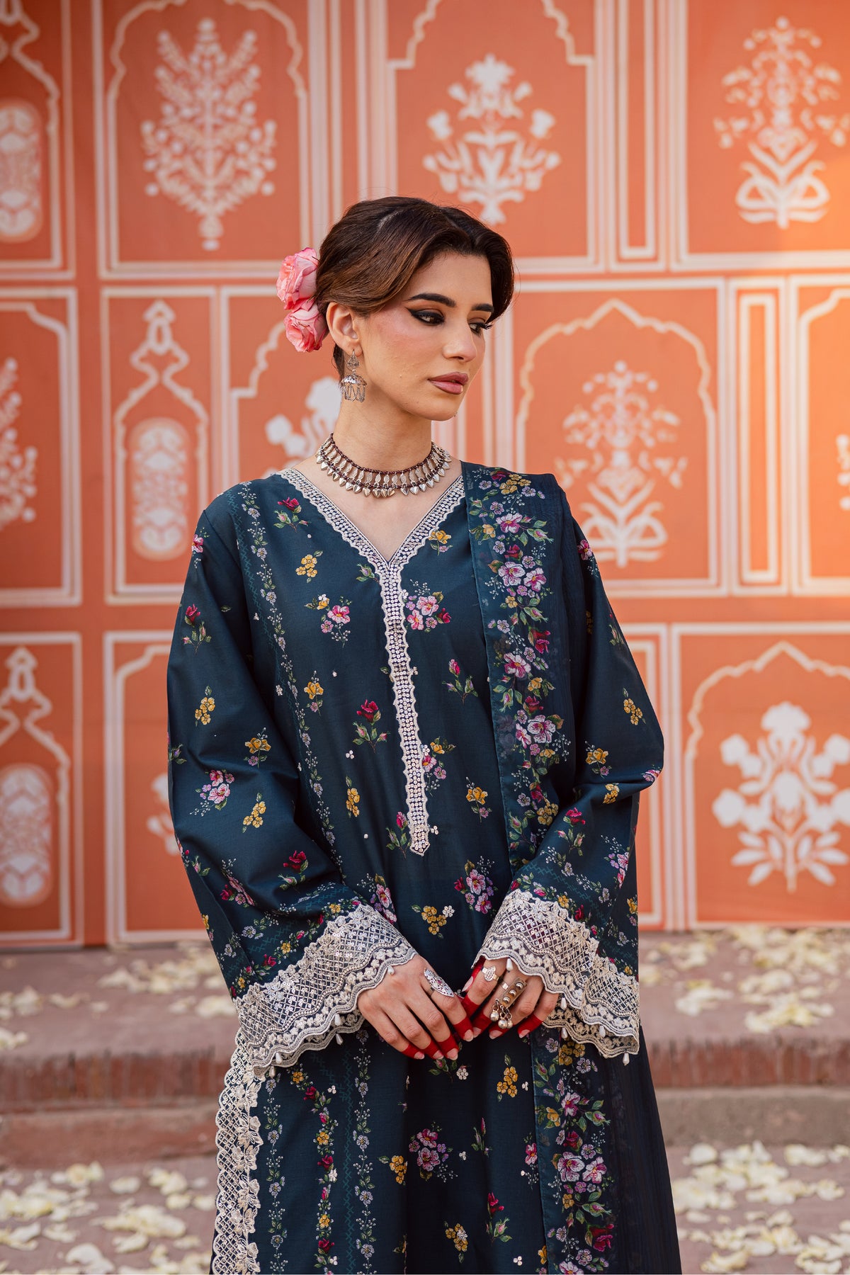 A medium silk printed dupatta completes the ensemble, offering soft texture and graceful finishing.