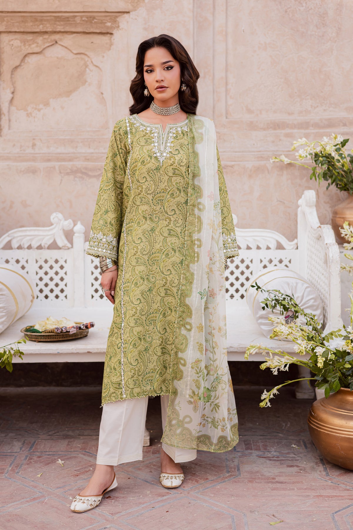 This three-piece ensemble features a digital printed long shirt with sleeves, accented with subtle embroidery along the neckline, panels, and sleeves for understated elegance.