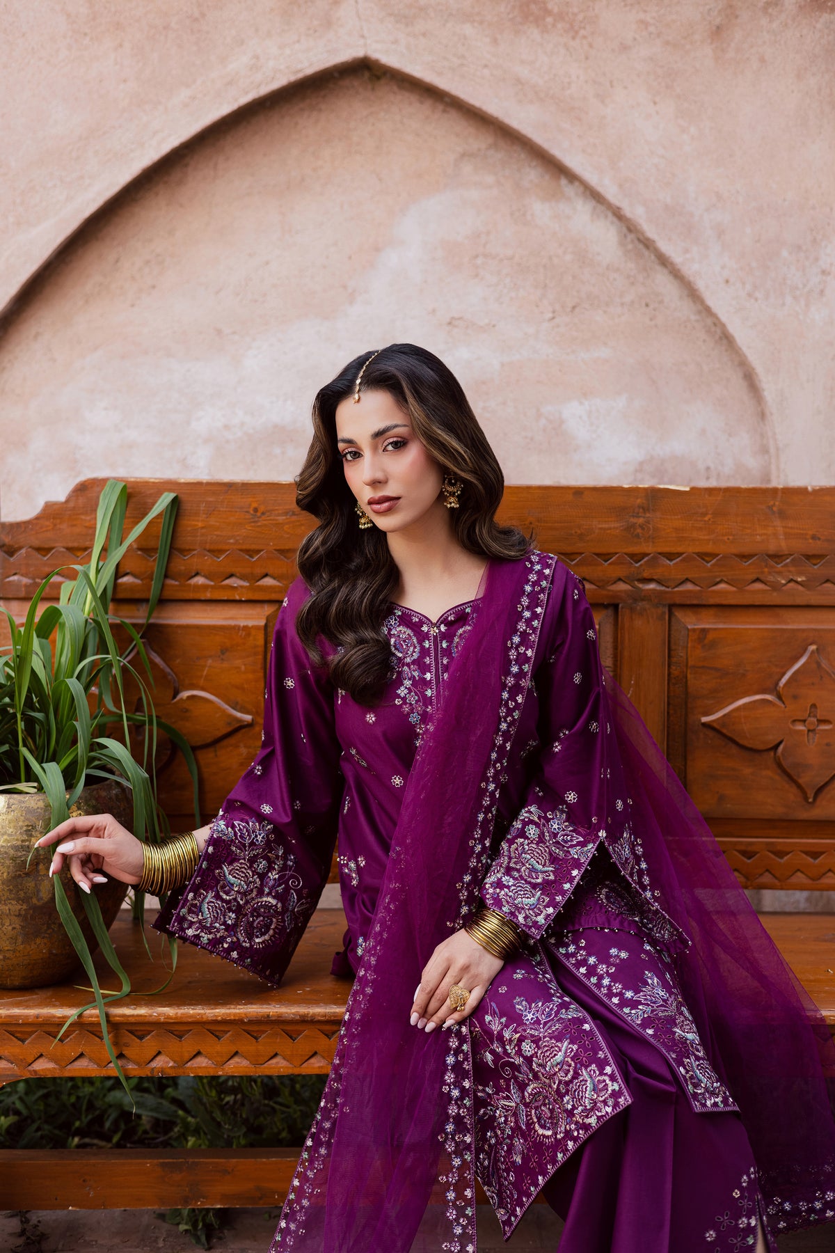 A net embroidered dupatta completes the ensemble, introducing softness and polished festive refinement.