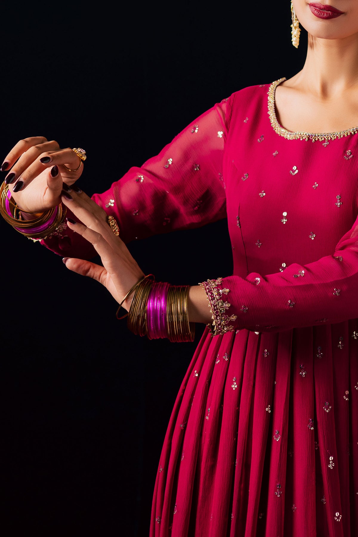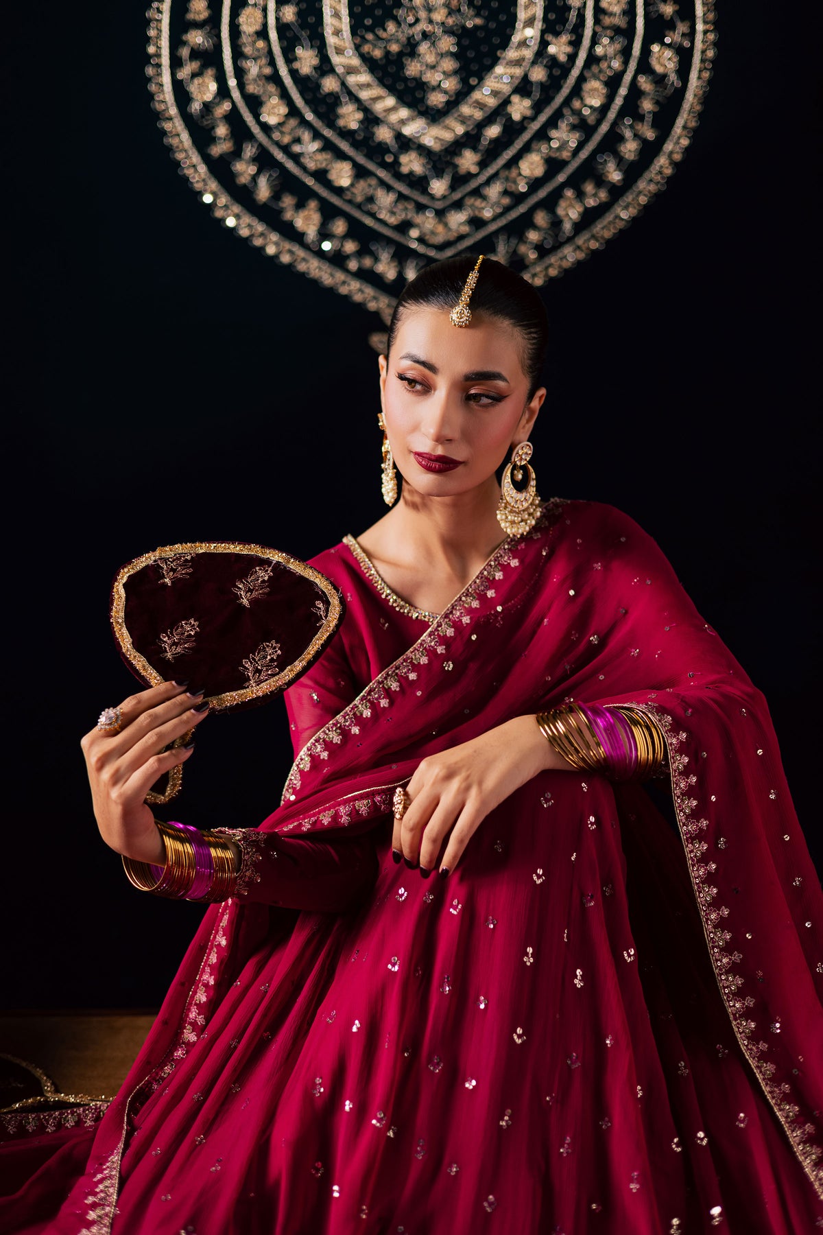 Completing the look is a softly draped crinkle dupatta featuring minimal sequin embroidery. The subtle shimmer of sequins adds just the right amount of festive charm, making this ensemble a perfect choice for both evening gatherings and celebratory occasions.