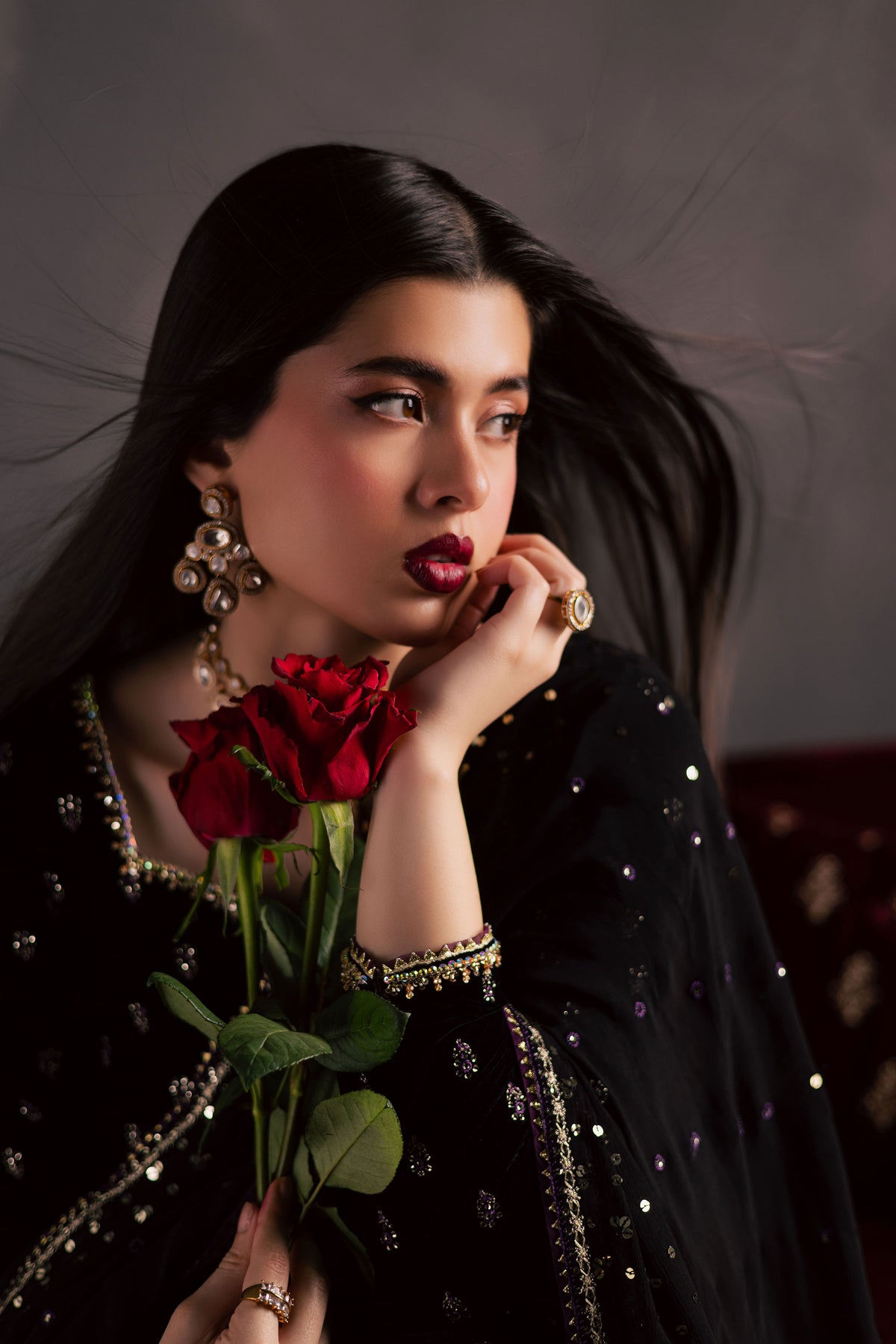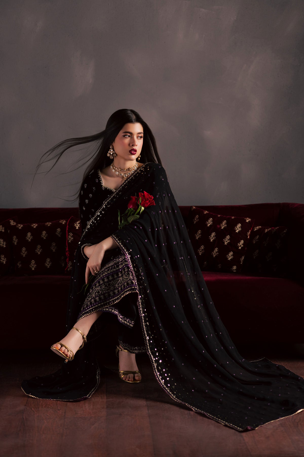 This refined three piece ensemble exudes timeless sophistication with its fully embroidered long-length black shirt, intricately adorned with adda work along the neckline. The detailed embroidery brings depth and elegance, while the hem and sleeves are finished with delicate lace, adding a graceful, feminine touch. The silhouette flows beautifully, combining traditional craftsmanship with understated luxury.
