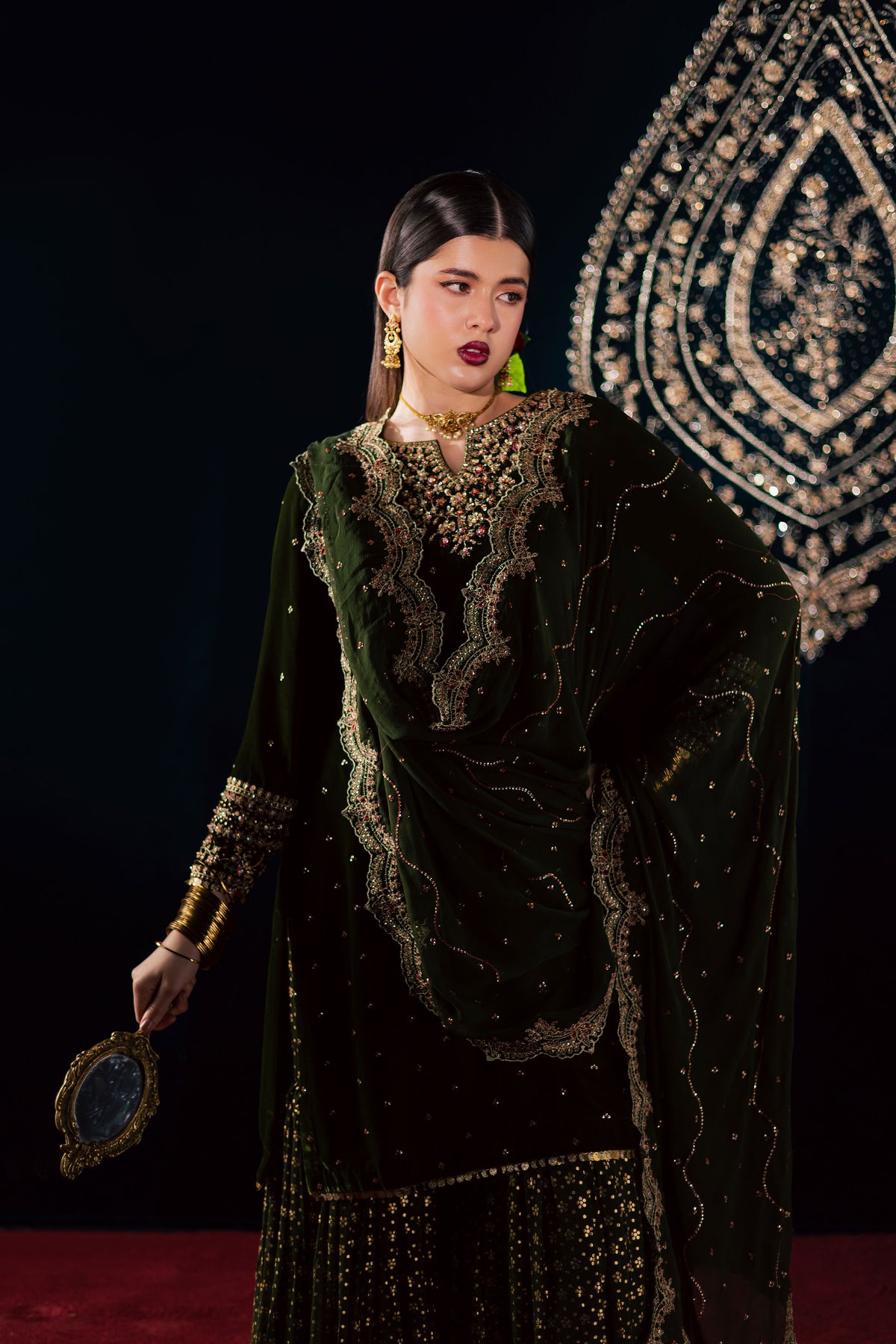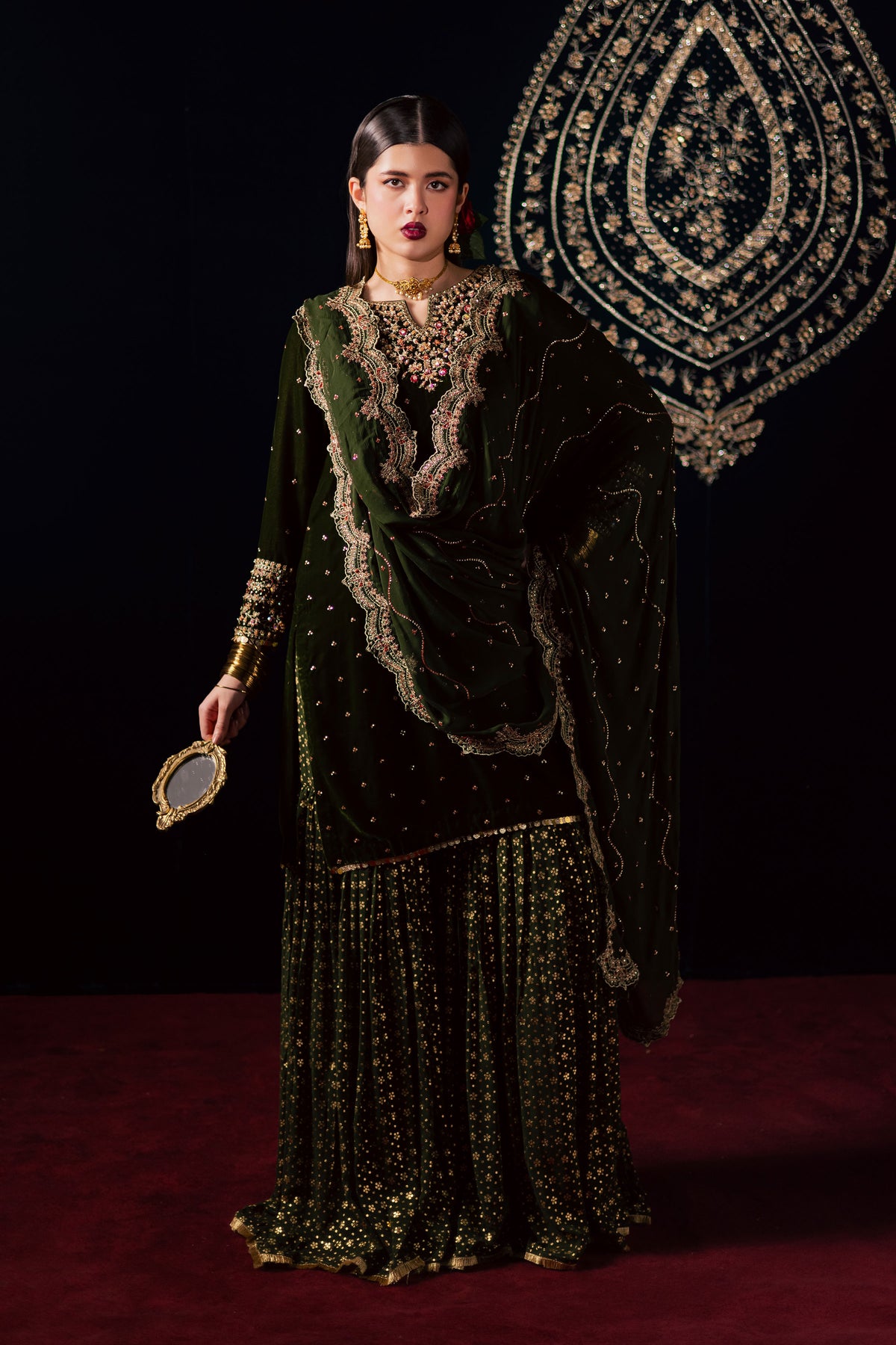 This exquisite three piece ensemble features a velvet short shirt adorned with a delicate sequin embroidery spread and a composed neckline accented with subtle adda work. The fitted sleeves are beautifully finished with embroidered borders, further enhanced with fine hand embellishments that add a touch of shimmer and sophistication. The rich texture of velvet paired with the detailed craftsmanship makes this outfit a true statement of refined elegance.