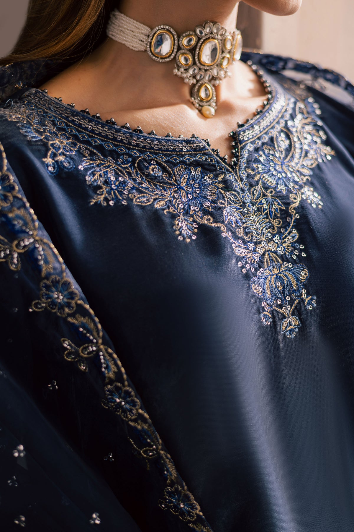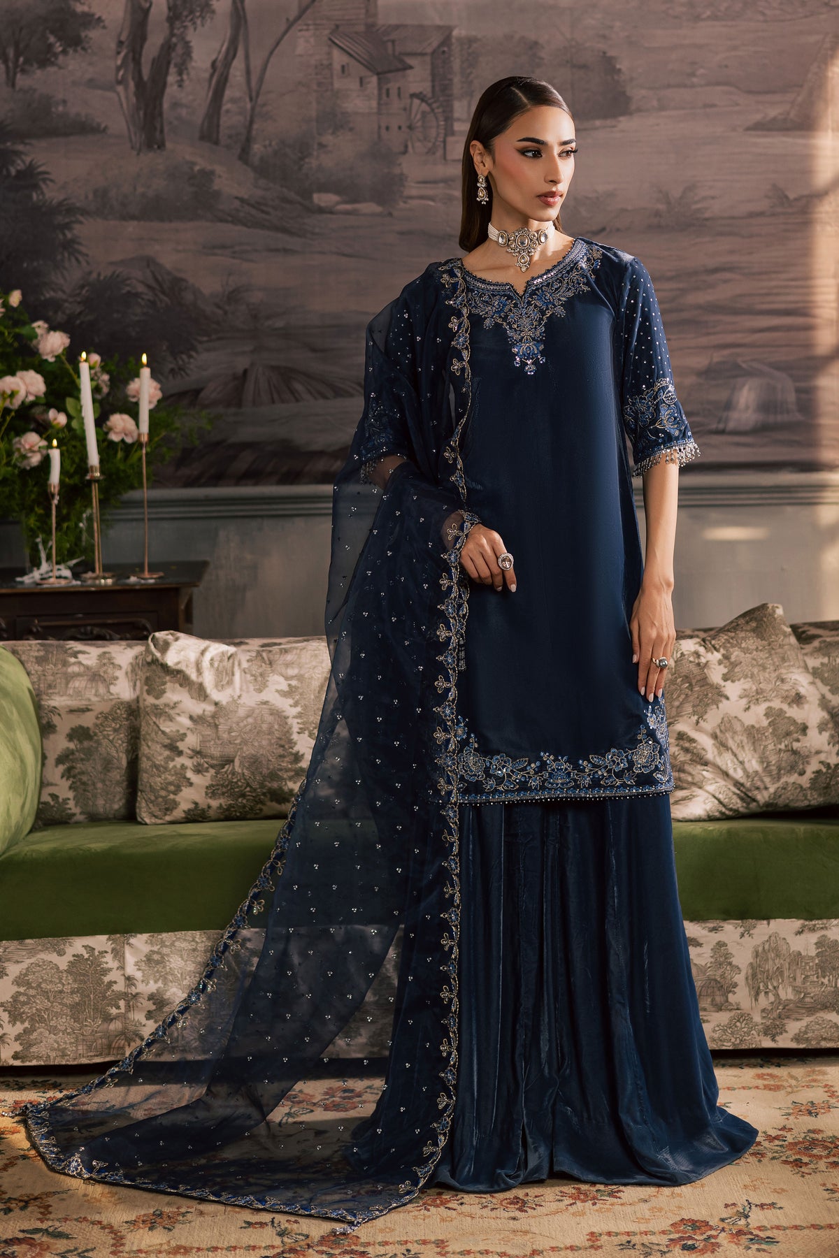 An embroidered organza dupatta completes the outfit, adding lightness, texture, and a graceful finish to the overall look.