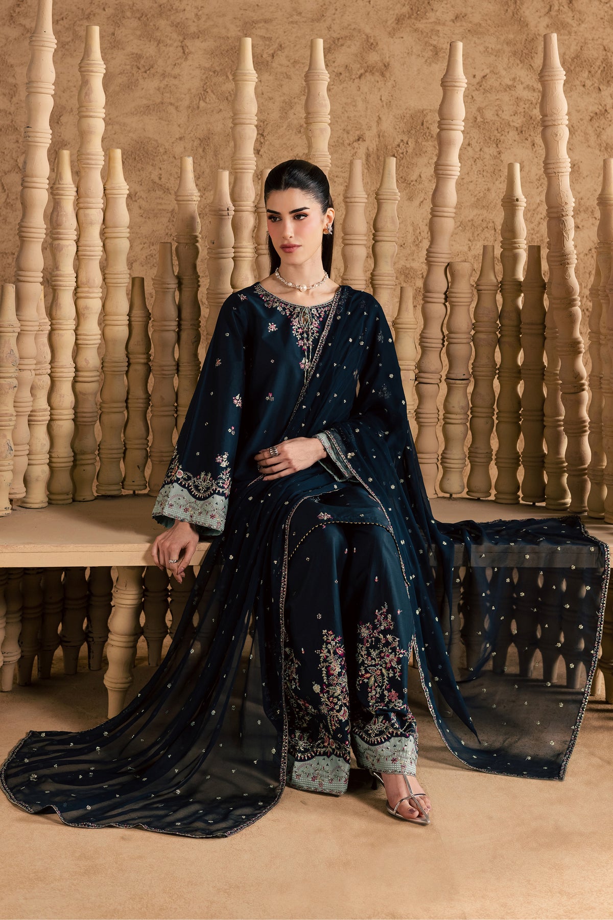 Paired with a shalwar adorned in heavily composed embroidery, with matching color-blocked embroidered patches on the hem, adding depth and festive elegance to the ensemble.