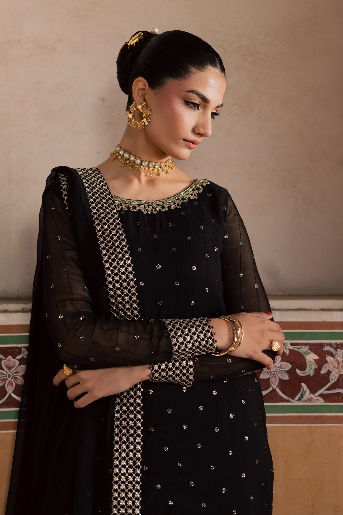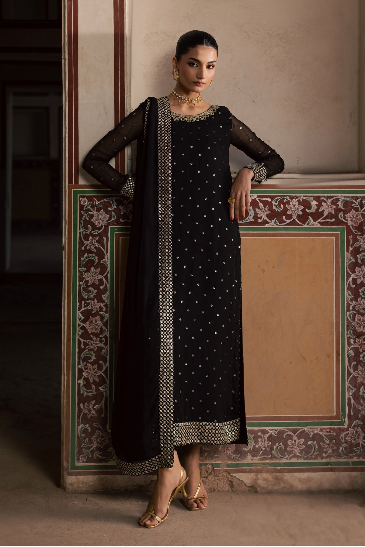 This black ensemble features a crinkle shirt detailed with sequin embroidery, creating a subtle shimmer across the surface. The design keeps the look refined while allowing the texture to stand out.