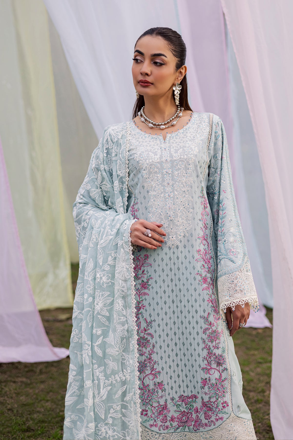 This three-piece Pima lawn Eid outfit features a ice blue long shirt with sleeves, richly embroidered with intricate sleeve and border detailing. Lace and crystal accents along the neckline, sleeve hem, and shirt hem enhance its festive radiance.
