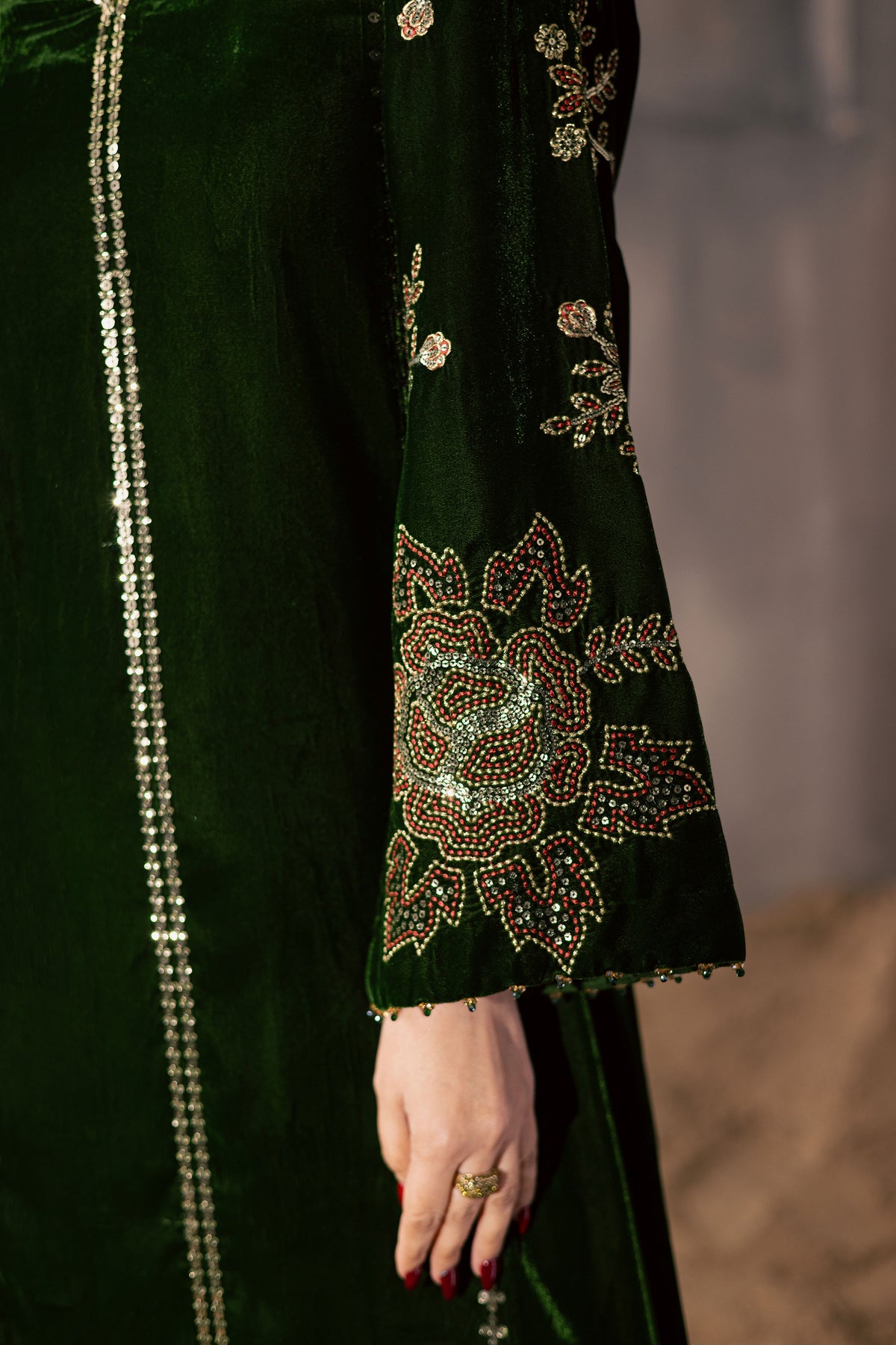 This moss green two piece set features a velvet long shirt adorned with delicate sequin embroidery and soft crystal detailing along the neckline, sleeve hem, shirt hem, and sides. The sleeves are heavily embroidered, adding texture and depth to the clean, elegant silhouette.