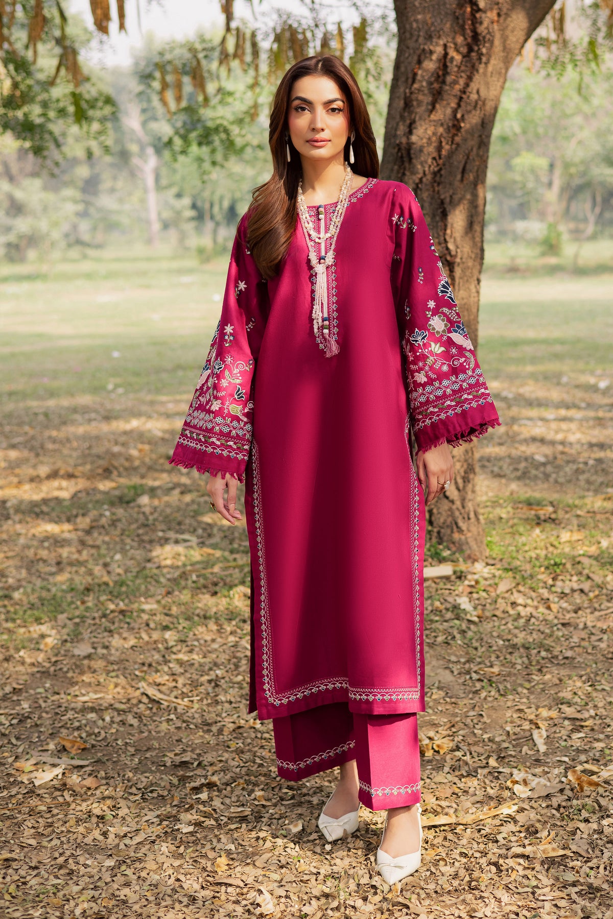 This raspberry pink elegant two piece khaddar set features heavily embroidered sleeves with detailed patchwork that creates a rich and textured look. The front carries minimal embroidery, finished with soft tassels for a simple yet refined touch.