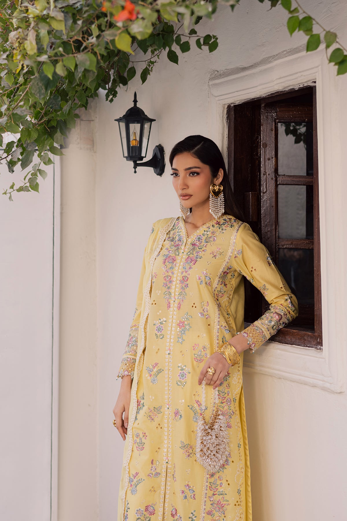 This Eid lawn set features a long four panelled front open shirt, detailed with heavy composed embroidery and bowring accents across the front. The shirt is finished with organza borders, while the fitted sleeves are richly embroidered and finished with matching organza borders, giving the silhouette a refined festive feel.