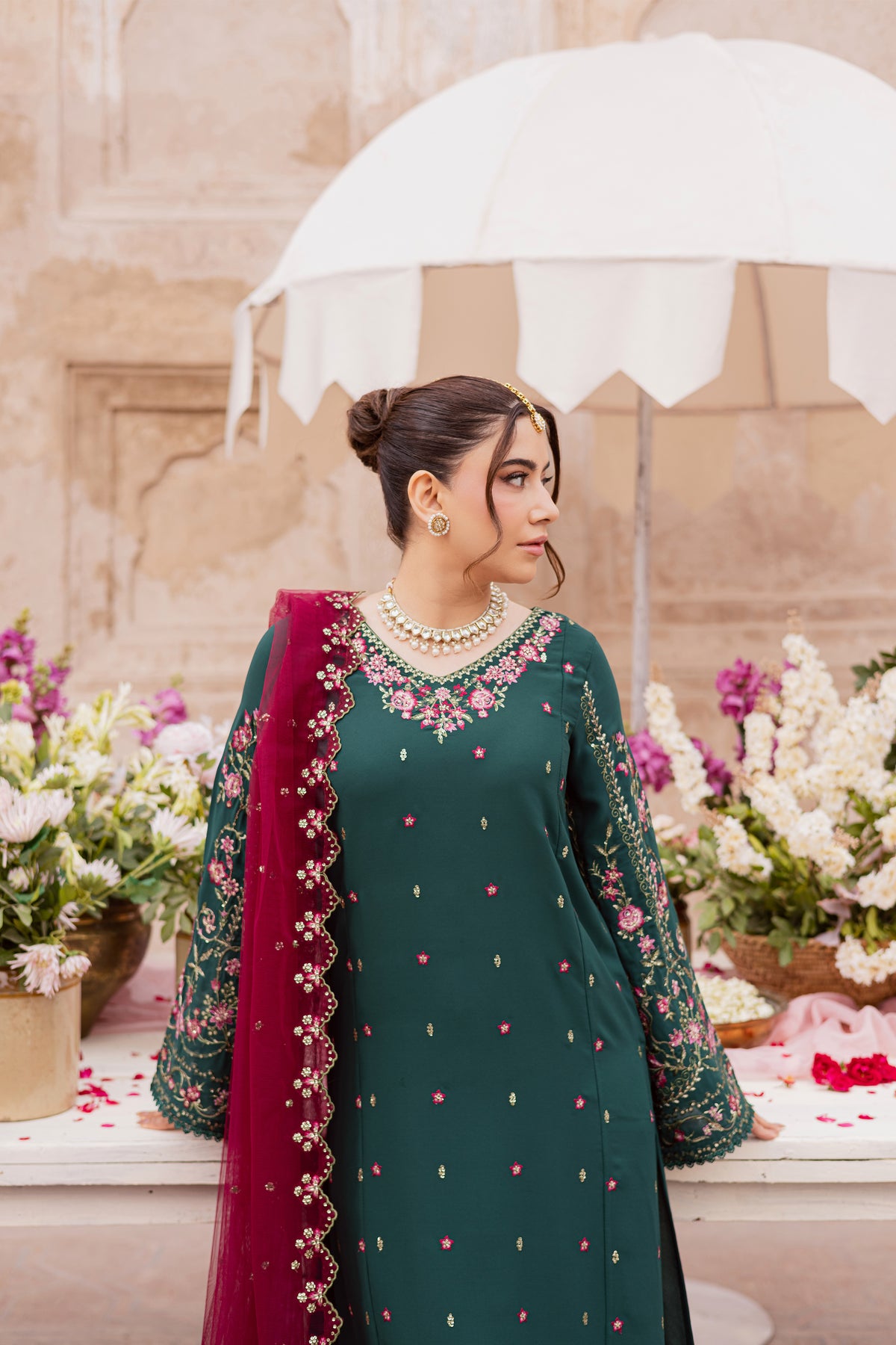 A matching chiffon dupatta completes the ensemble, finished with sequin detailing, corner embroidery, and tilla lace borders.