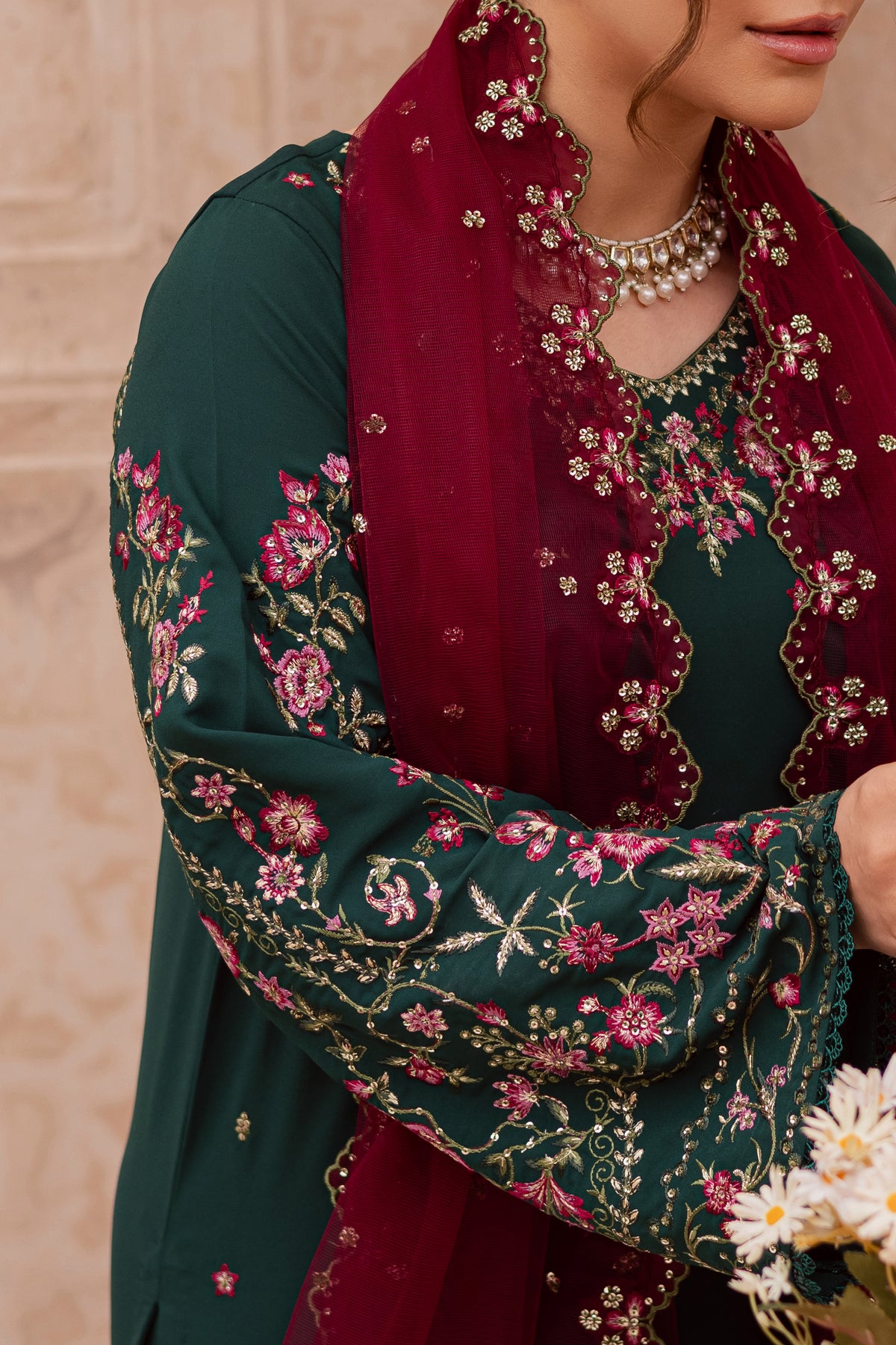 This deep red chiffon shirt is crafted with all over jaal embroidery, creating a rich and flowing surface. The neckline is enhanced with detailed adda work, while crystal accents at the sleeve hems add subtle shine.