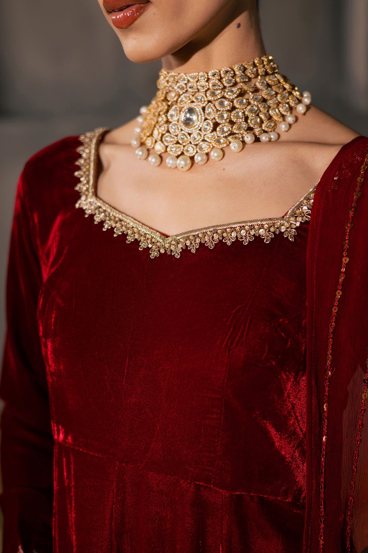 This striking three piece red velvet ensemble features a red velvet long frock adorned with intricate adda work along the neckline. The frock is finished with heavily embroidered borders at the hem and delicate embroidered borders on the sleeves. Crystal detailing on the sleeves and a crystal tassel at the back neckline add a soft festive sparkle, giving the outfit a refined and elegant touch.