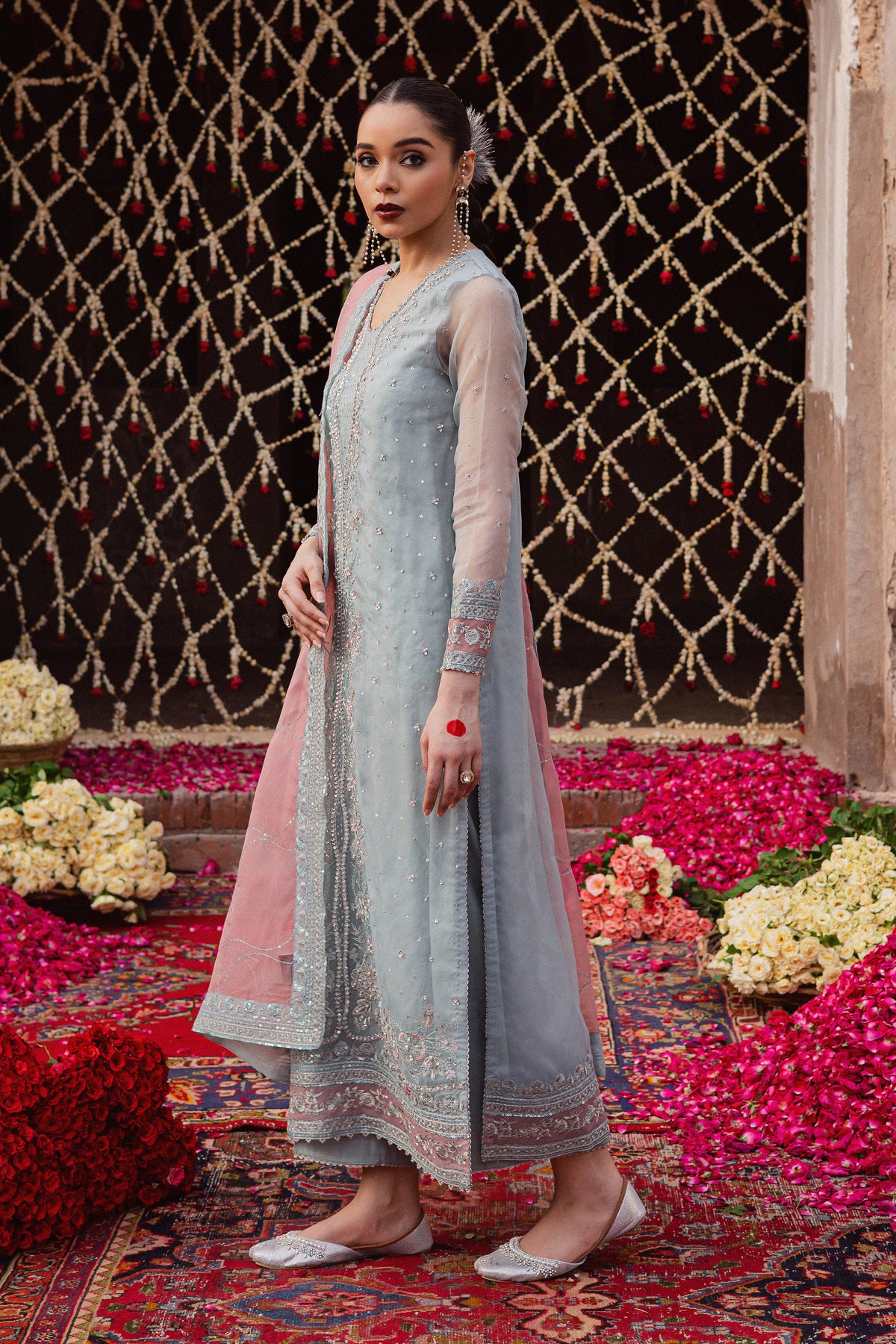 Elevate your style with this set, an ash blue front-open illusion organza shirt featuring intricately embroidered panels and delicate handwork throughout the front. Sequins spread in the center add subtle sparkle, while contrast organza borders enhance the front, back, and sleeve hems.Crystals accent the neckline, sleeve cuffs, and shirt hem, complemented by tilla lace detailing on the side chalks for refined elegance.