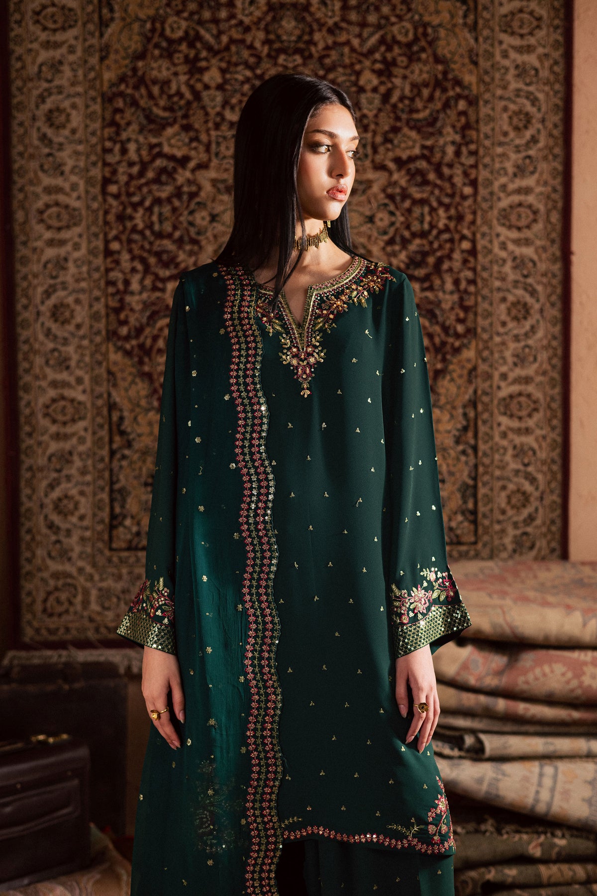 Paired with a farshi shalwar featuring an embroidered border and a subtle sequin spread, the look achieves the perfect blend of traditional artistry and refined elegance. The relaxed silhouette adds movement and sophistication to the design.