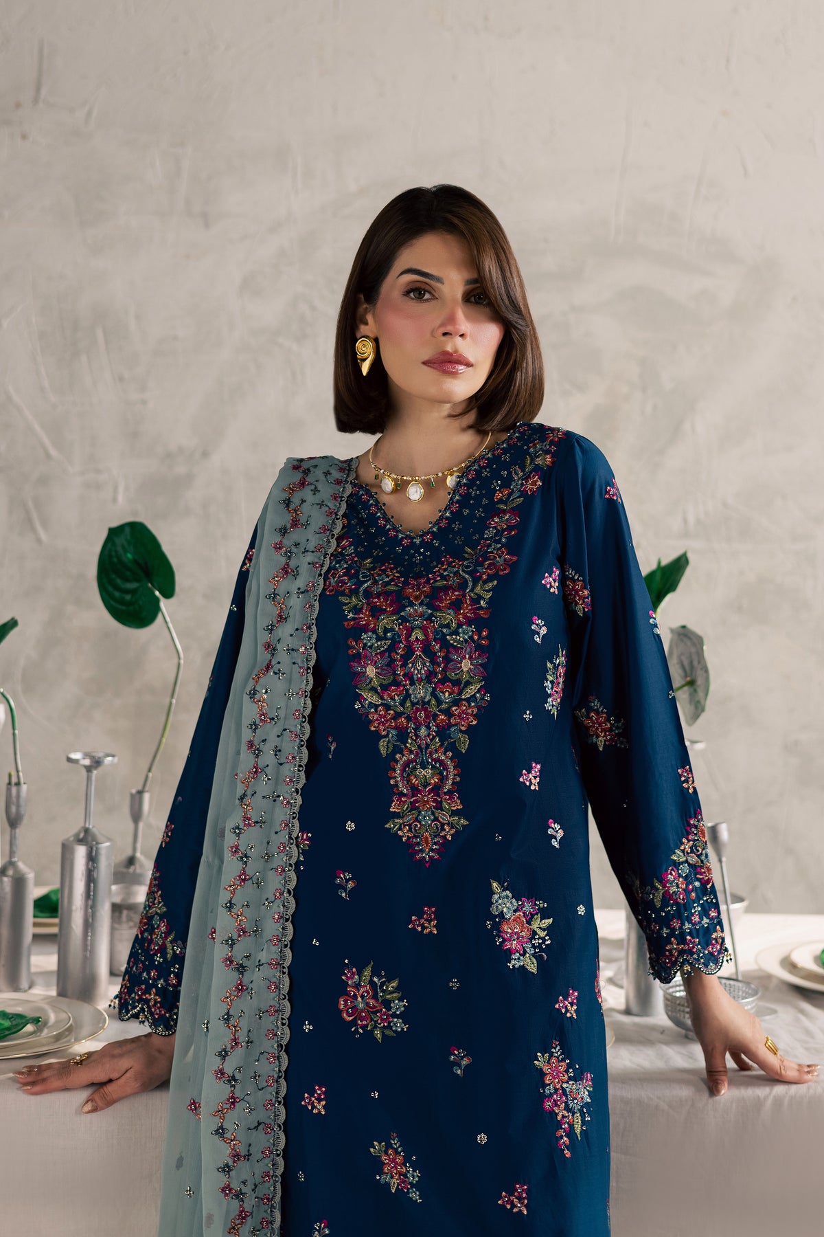 A contrast dupatta completes the ensemble, adding fluid movement and visual depth.