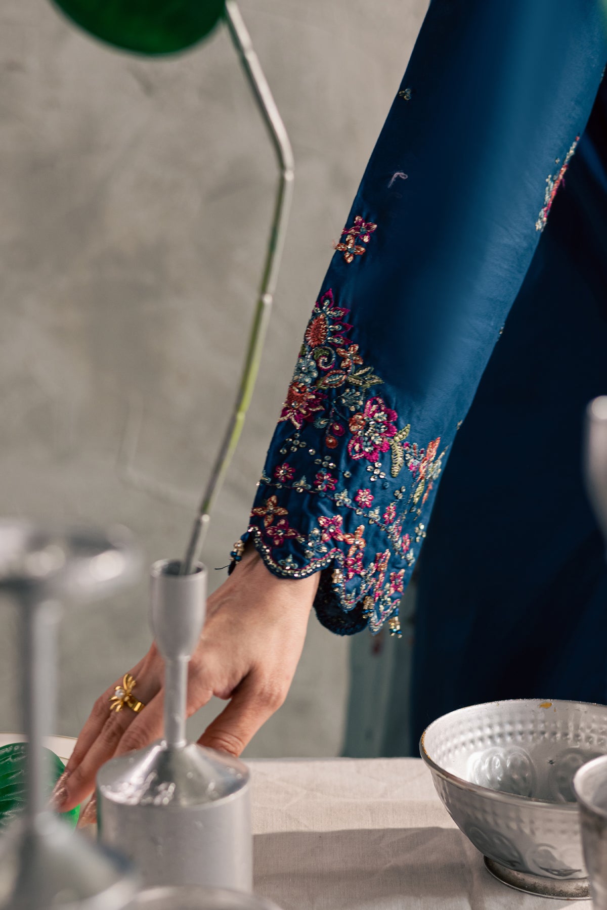 This three-piece ensemble features a teal long embroidered shirt detailed with an intricately embroidered neckline and a delicate spread throughout the silhouette. Subtle embellishments along the neckline and hem enhance the festive refinement.