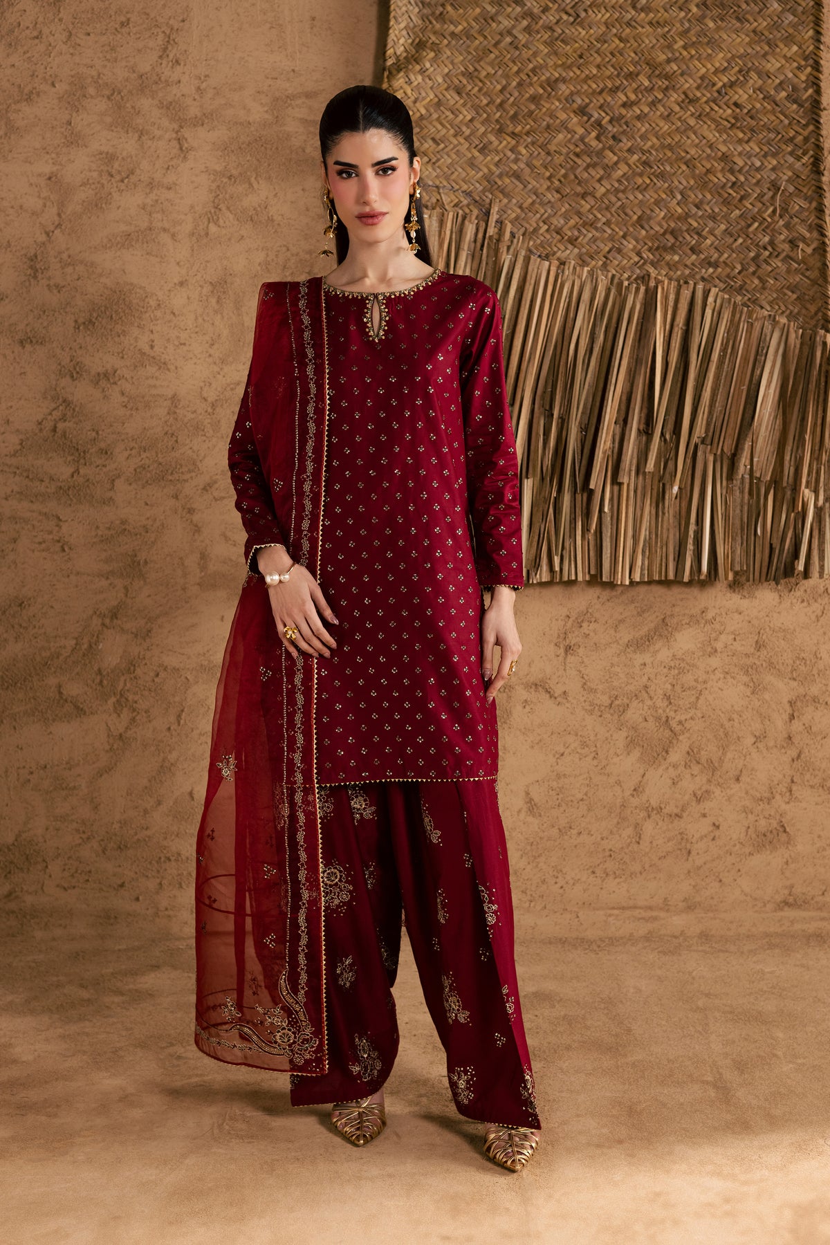 An embroidered organza dupatta completes the look, its delicate patterns and subtle shimmer adding a sophisticated festive flourish.