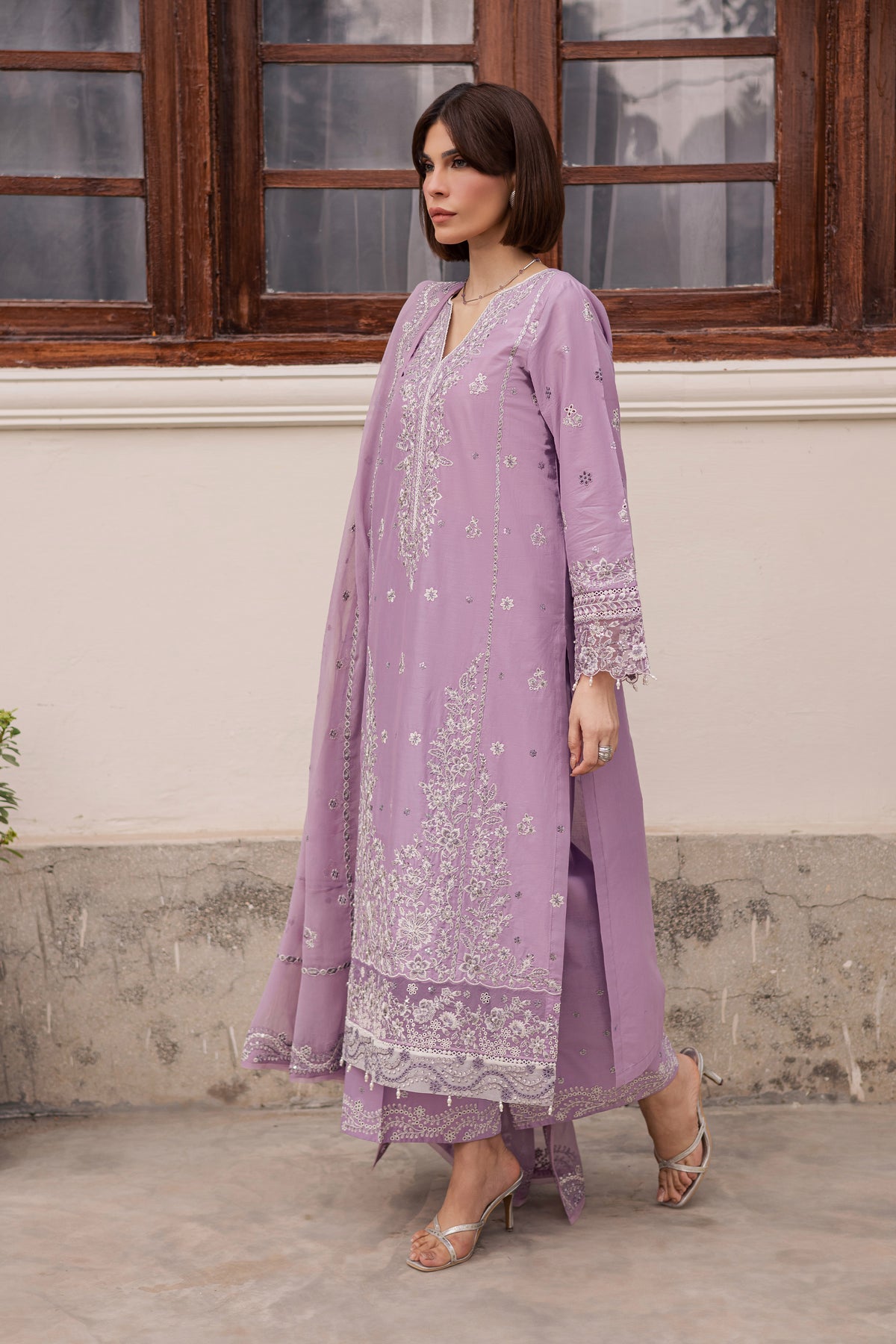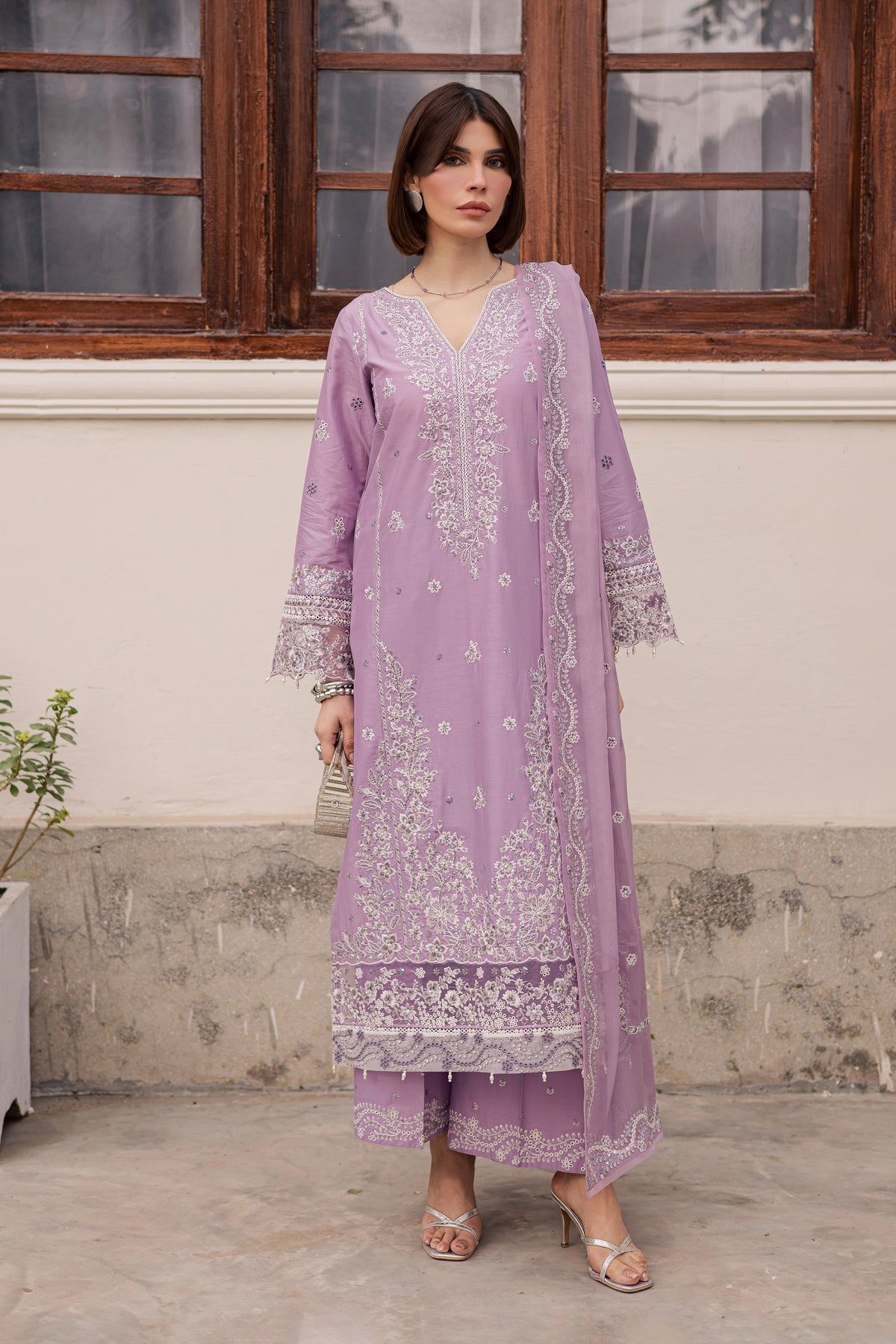 This Eid lawn set features a lilac panelled shirt adorned with intricate embroidery in white and tilla, accented with delicate pearl handwork. The shirt is finished with organza borders along the hem and sleeves, adding a soft festive structure to the silhouette.