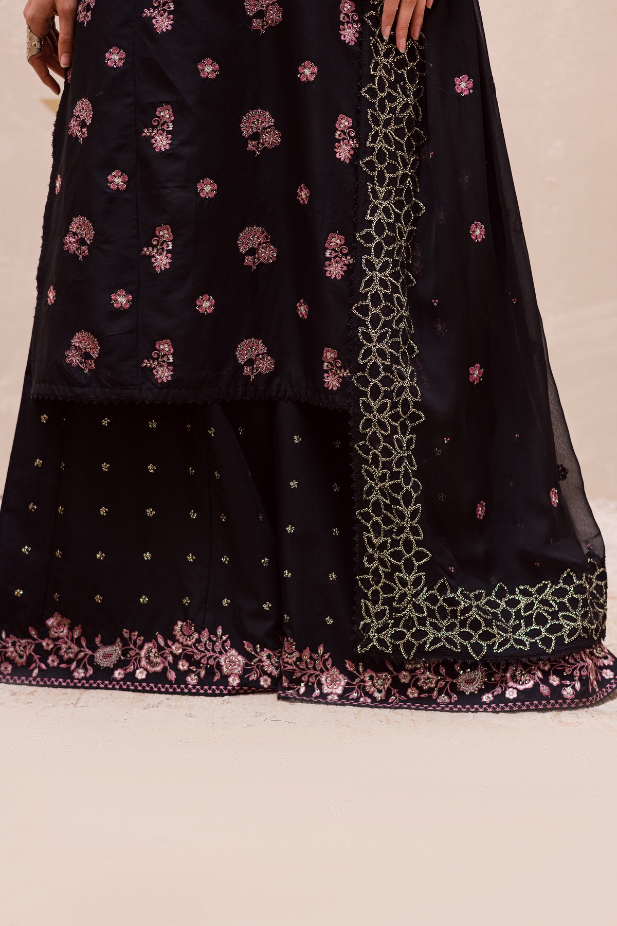 This three-piece ensemble features a black intricately embroidered shirt with sleeves, richly detailed with heavy embroidery and enhanced with lace and crystal embellishments along the neckline, sleeve hems, and shirt hem. The luminous accents elevate the silhouette into a striking formal festive statement.