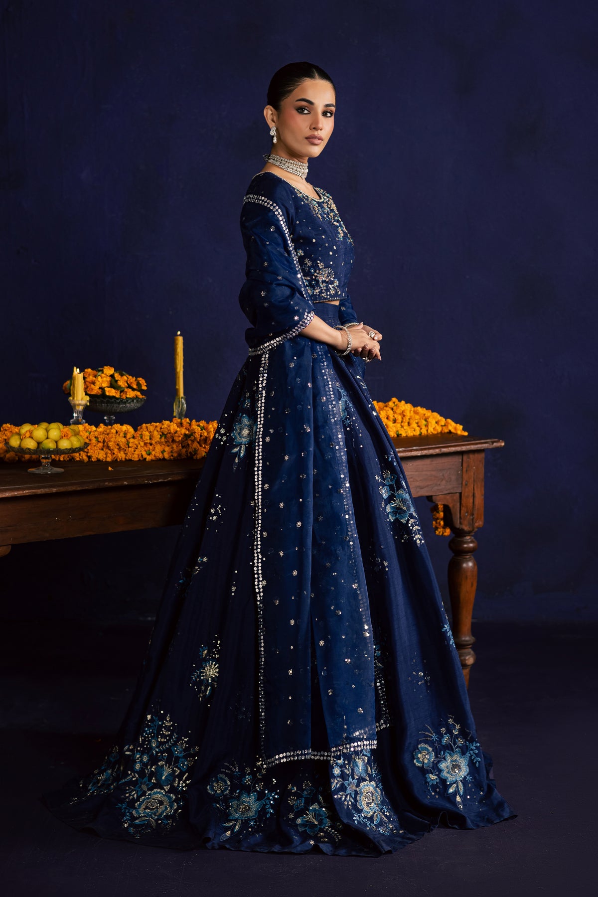 An organza dupatta completes the look, adorned with a sequin spread and a meticulously handcrafted border featuring sequin work and baithki crystals, adding elegance and a graceful finish to the ensemble.