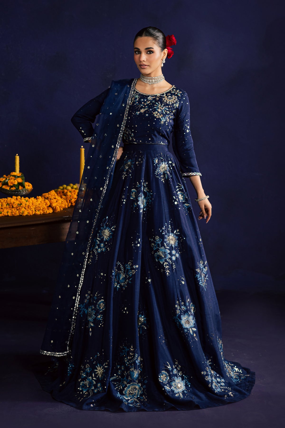 Paired with a flared raw silk lehenga, the ensemble showcases composed embroidered panels and scattered floral bunches around the flare in a monotone palette, highlighted with subtle sequin accents for a soft sparkle.