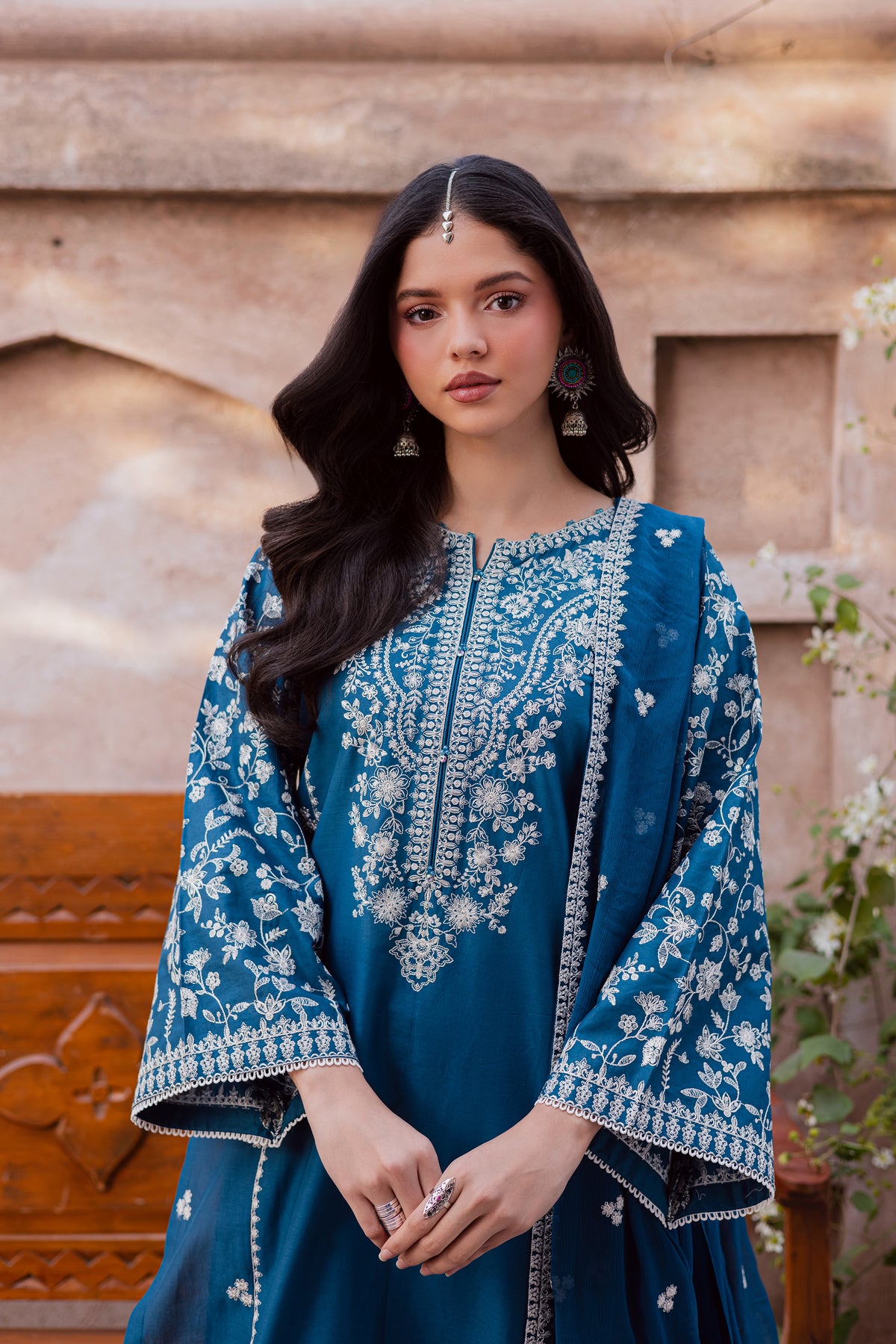 This three-piece ensemble features a long moroccon blue embroidered shirt with sleeves, detailed with a heavily embellished neckline and a dense jaal across the sleeves. An embroidered spread along the sides enhances the silhouette, creating depth and refined festive structure.