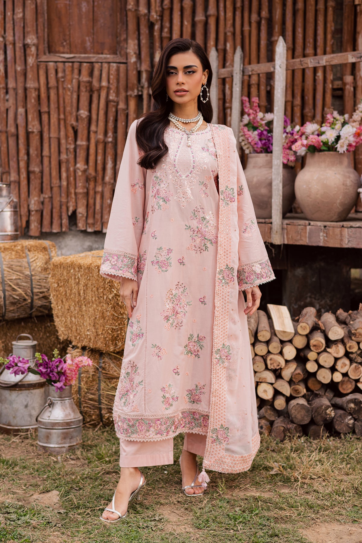 This three-piece Pima lawn Eid outfit features a long paneled shirt with sleeves, detailed with colorful embroidery and pearl accents at the neckline. Lace accents throughout the shirt enhance its festive refinement.