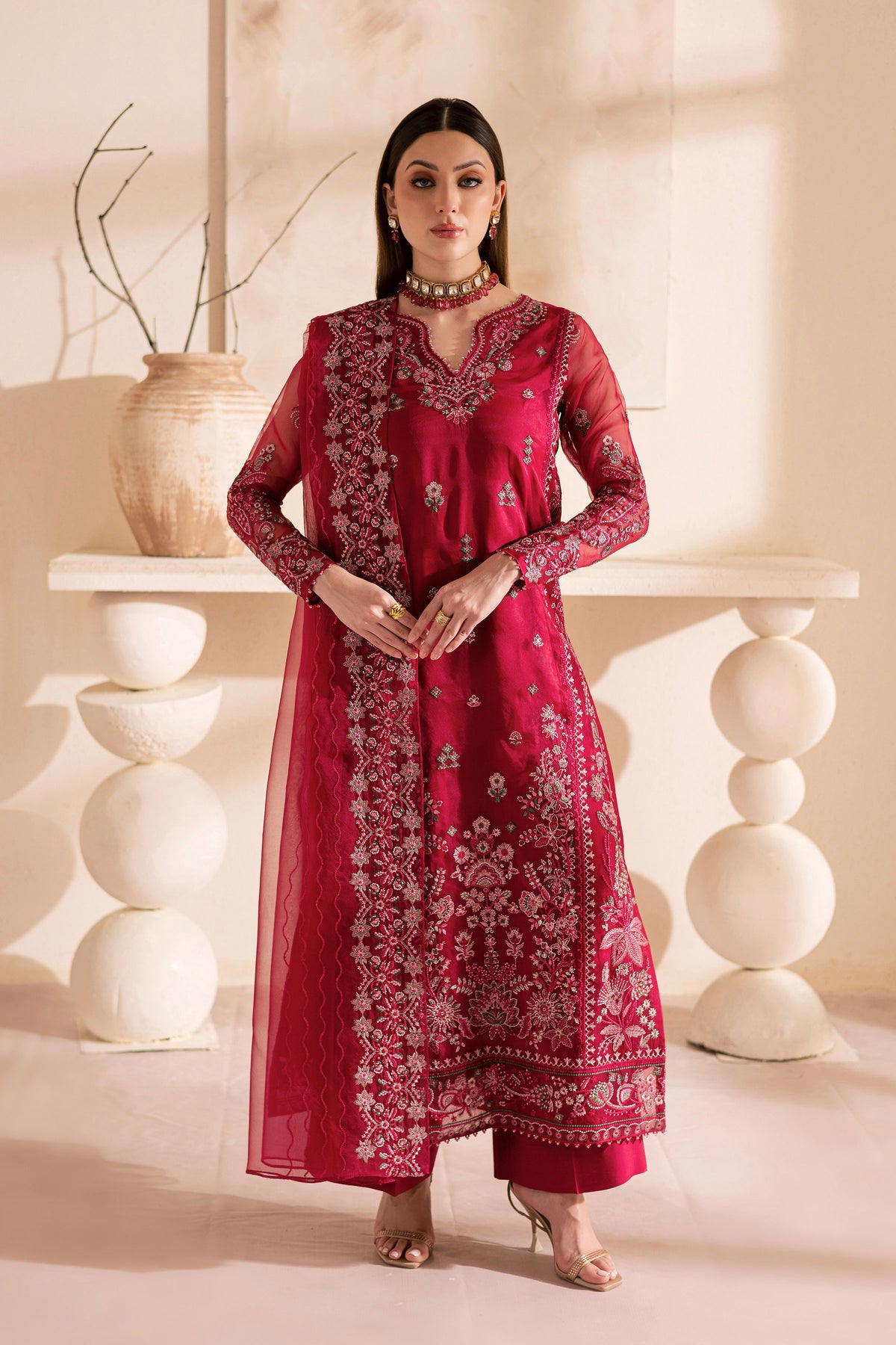 An embroidered organza dupatta completes the look, adding a layer of ethereal grace. Its delicate embroidery and airy drape bring harmony to the ensemble, making it a statement of timeless luxury and festive allure