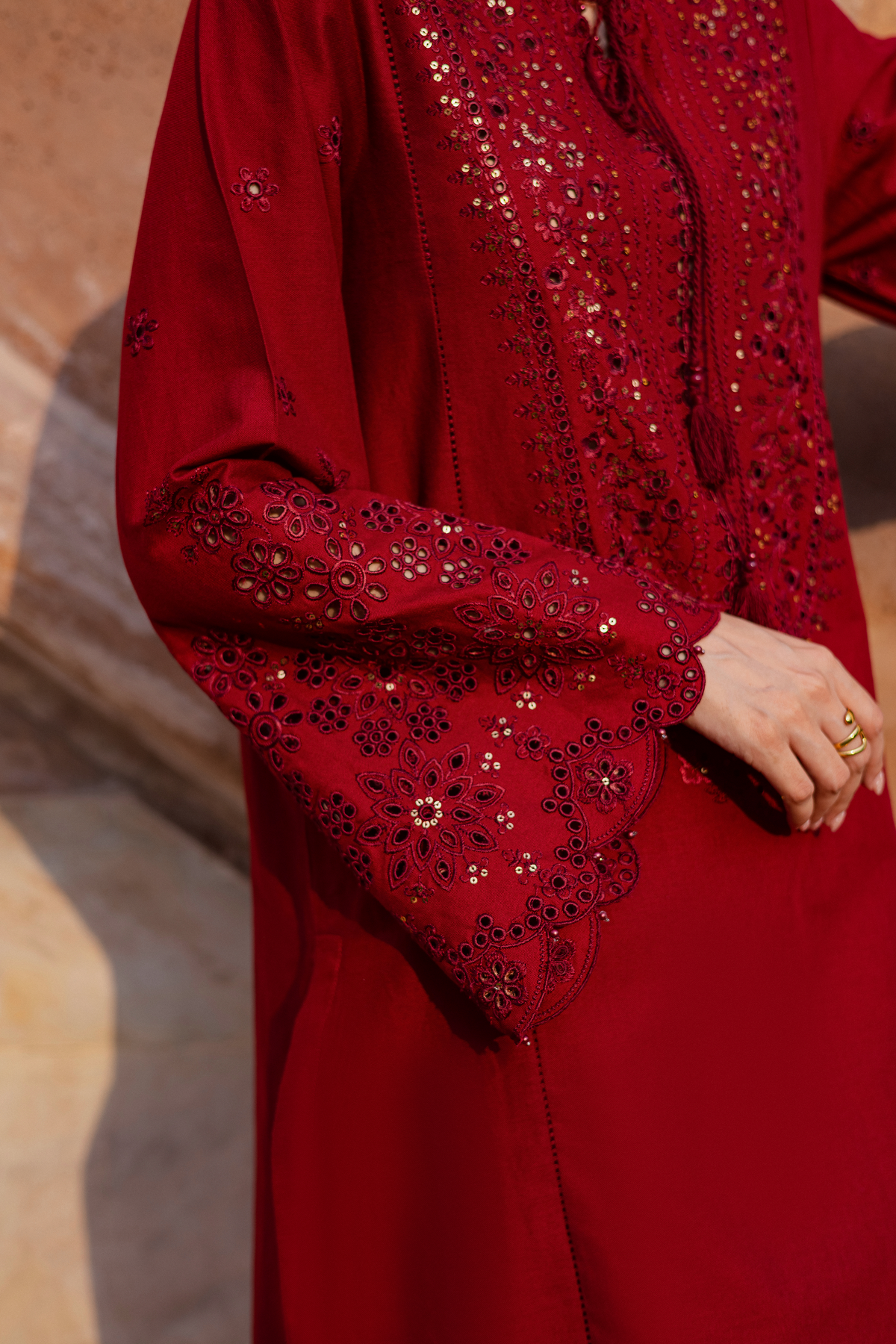 Paired with elegantly embroidered khaddar culottes, also detailed with the same kabua finish, the set achieves a perfect harmony of grace and grandeur. This ensemble is designed for the woman who values luxury in the finer details, offering a look that is both timeless and captivating.