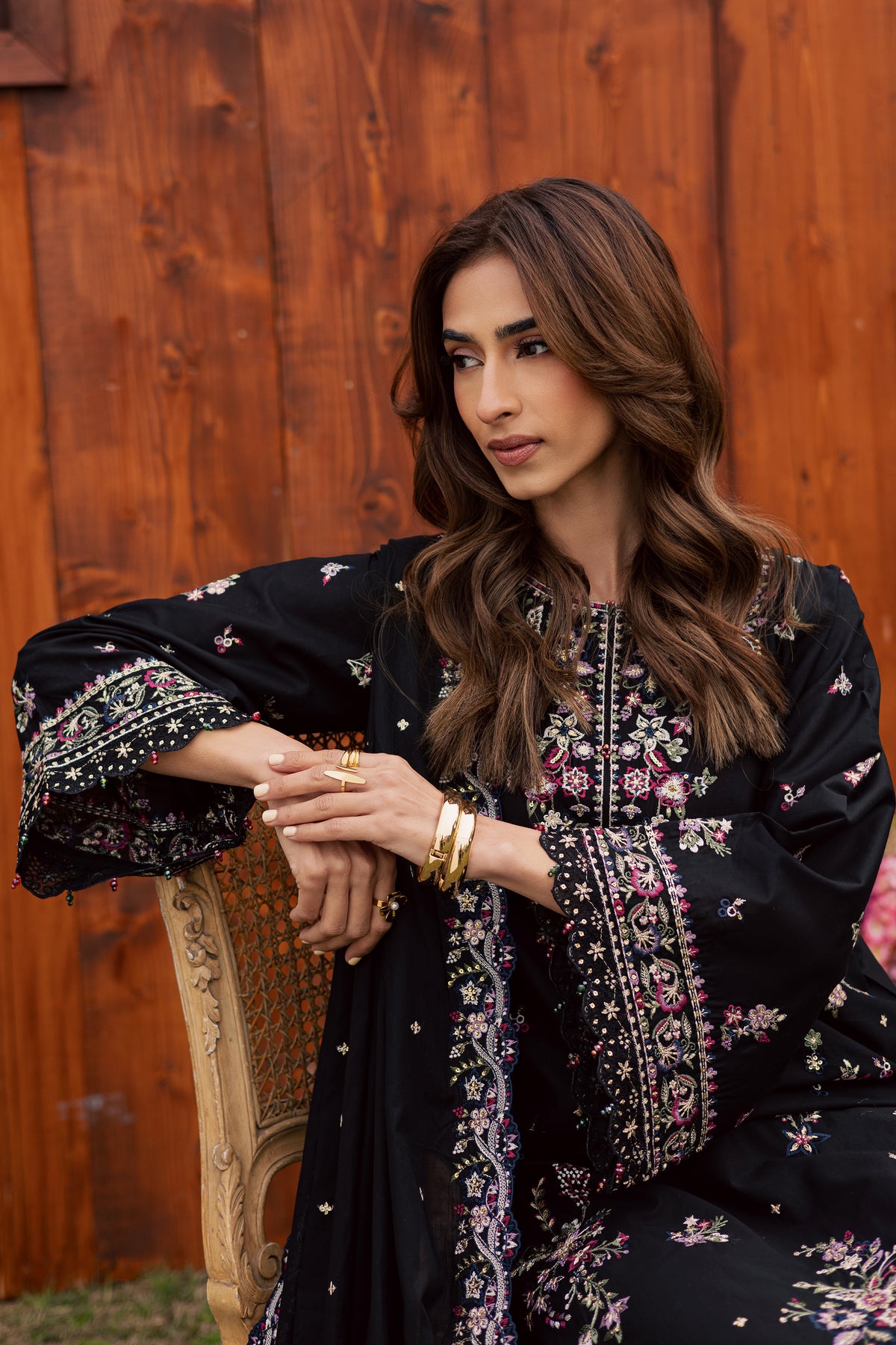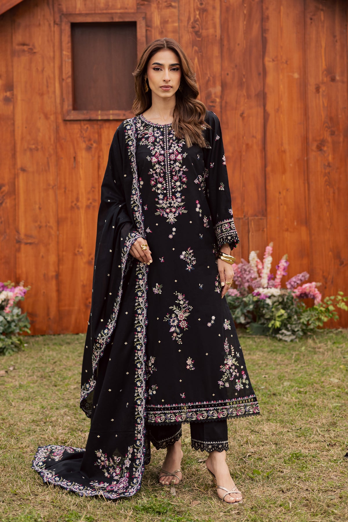 The embroidered lawn dupatta features kavya-finished borders, draping softly to elevate the festive ensemble.