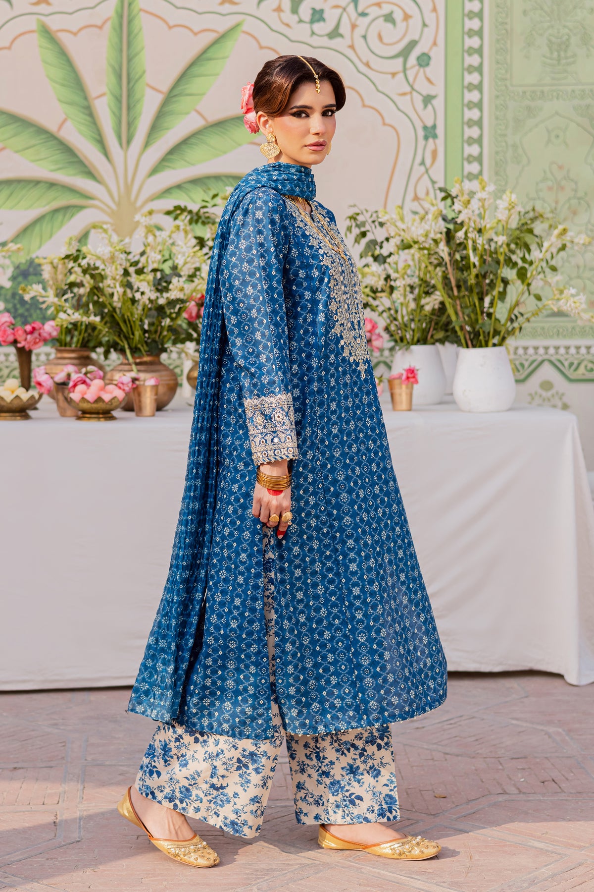 This three-piece ensemble features a blue long printed panel shirt with sleeves, detailed with an embroidered neckline and embroidered border for structured refinement.