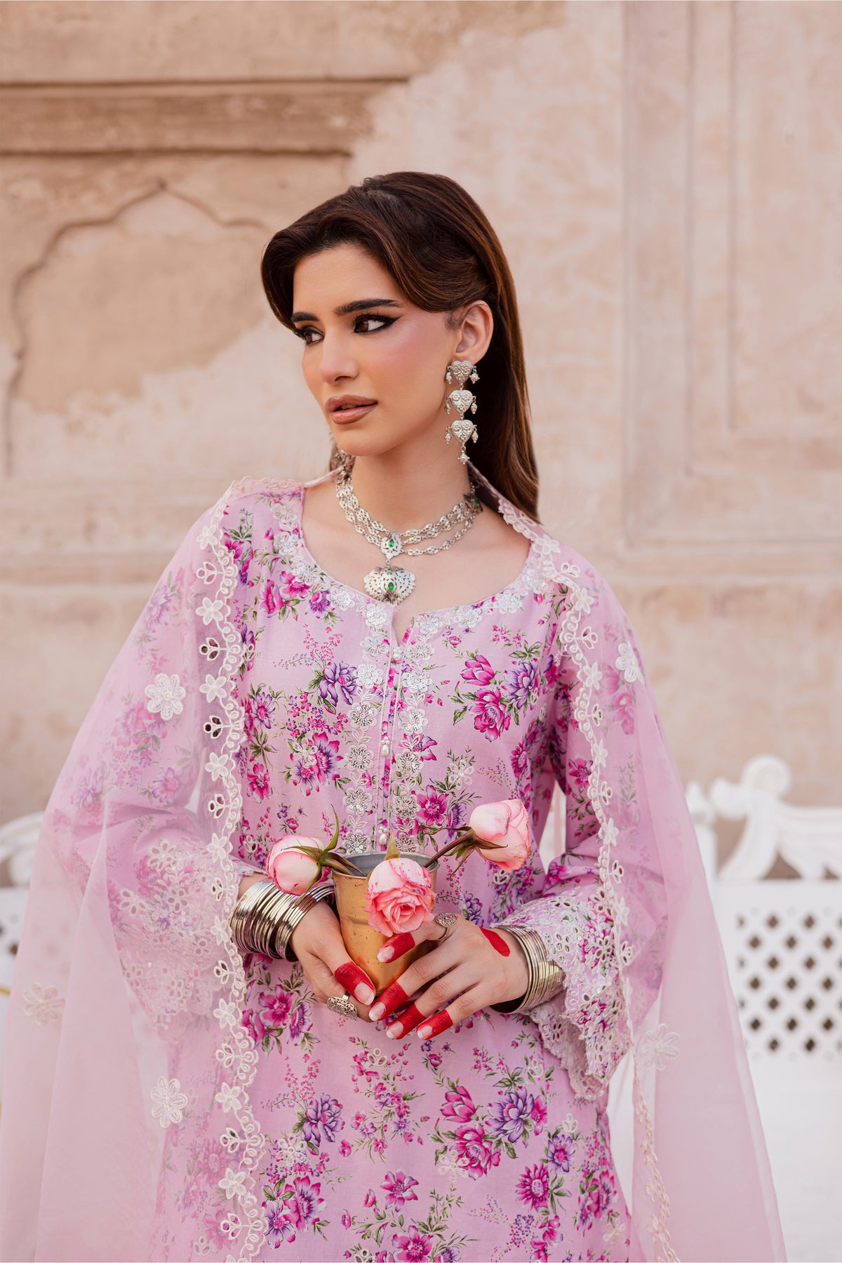 An organza embroidered dupatta completes the ensemble, bringing delicate texture and refined elegance.