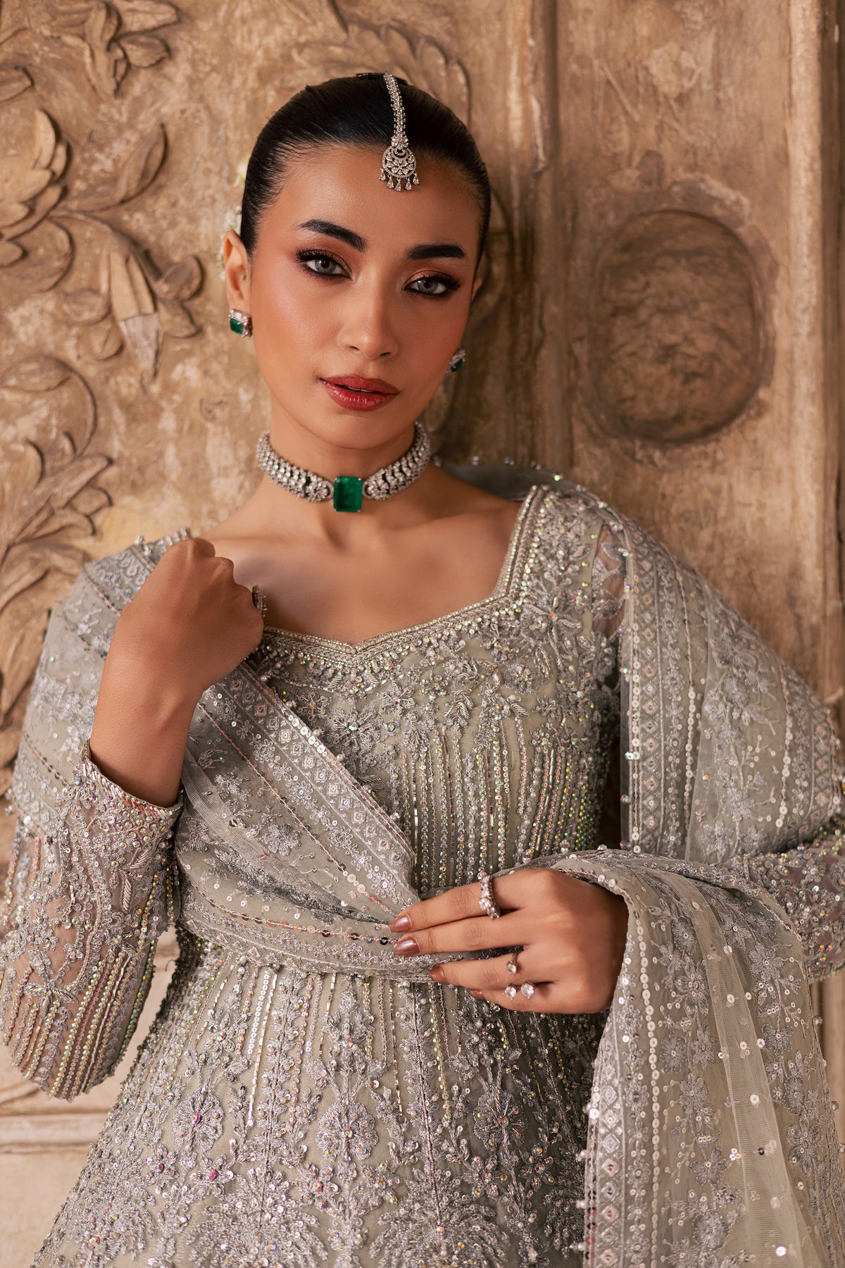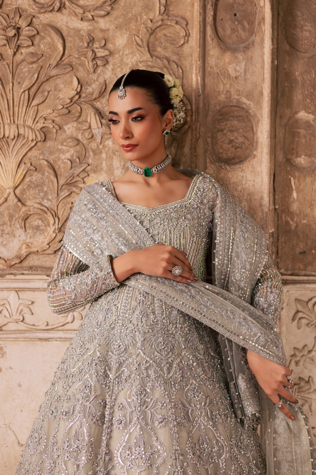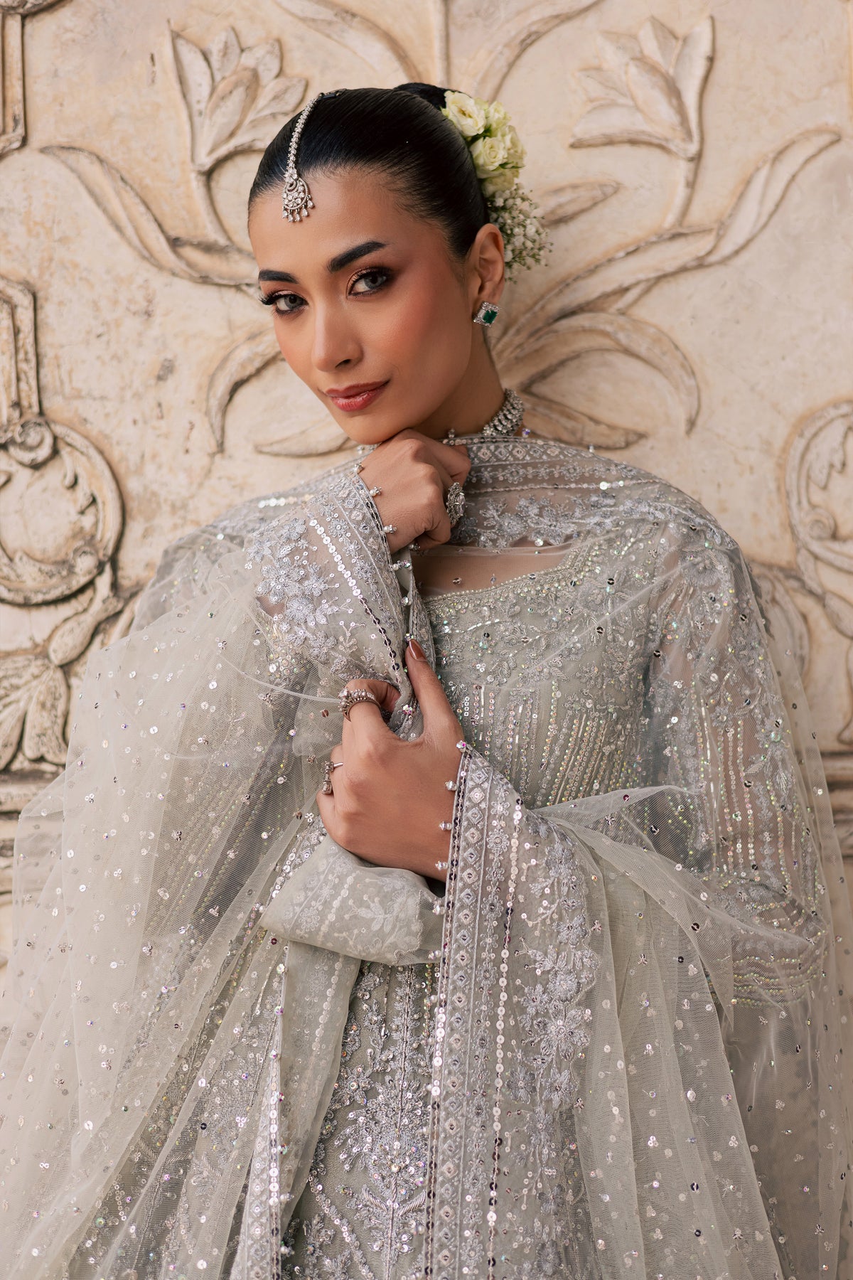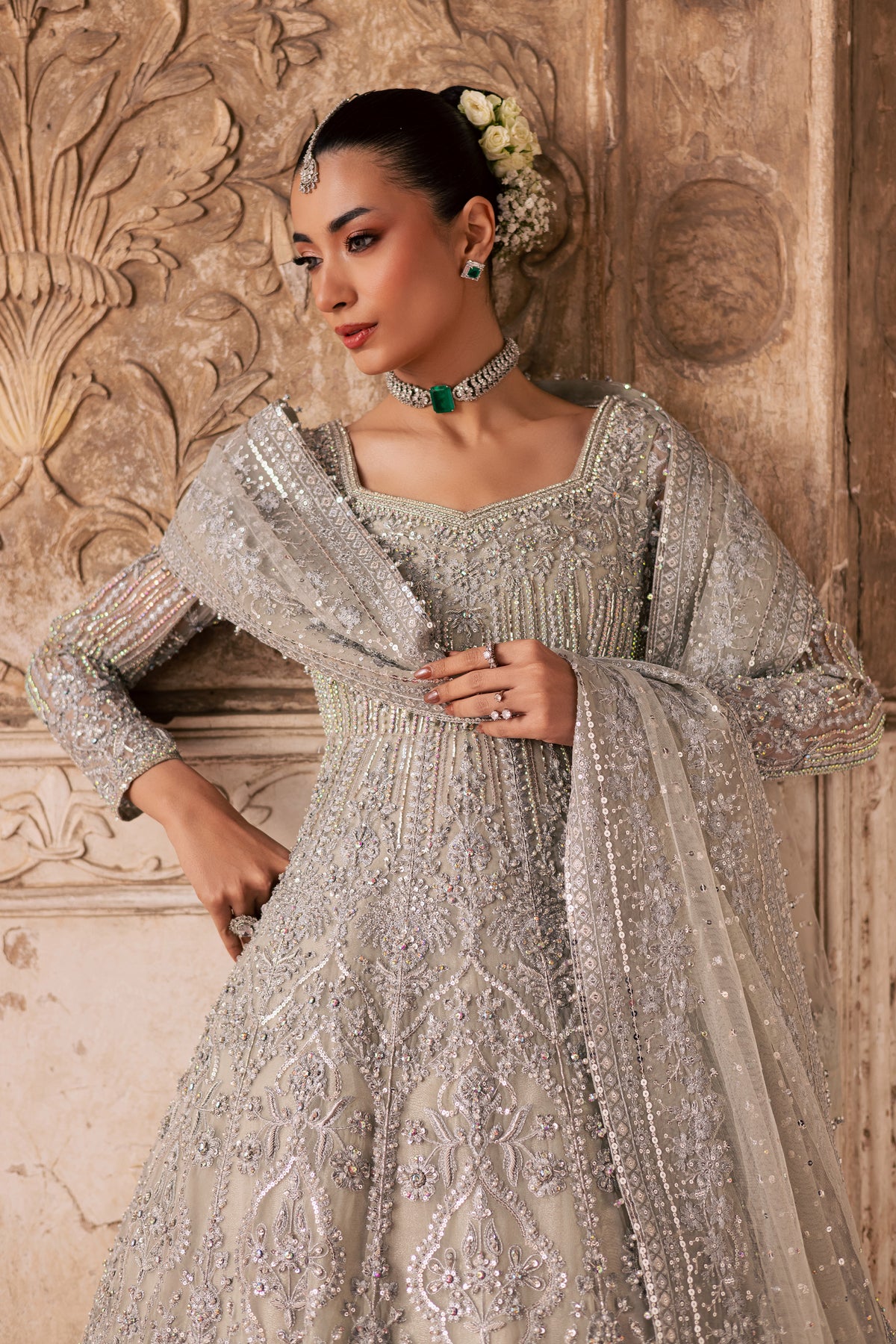 A symphony of light and craftsmanship, this all silver bridal ensemble captures the softness of dawn and the radiance of celebration. With layered textures, meticulous handwork, and a silhouette that moves with grace, the design embodies modern elegance wrapped in timeless bridal artistry.