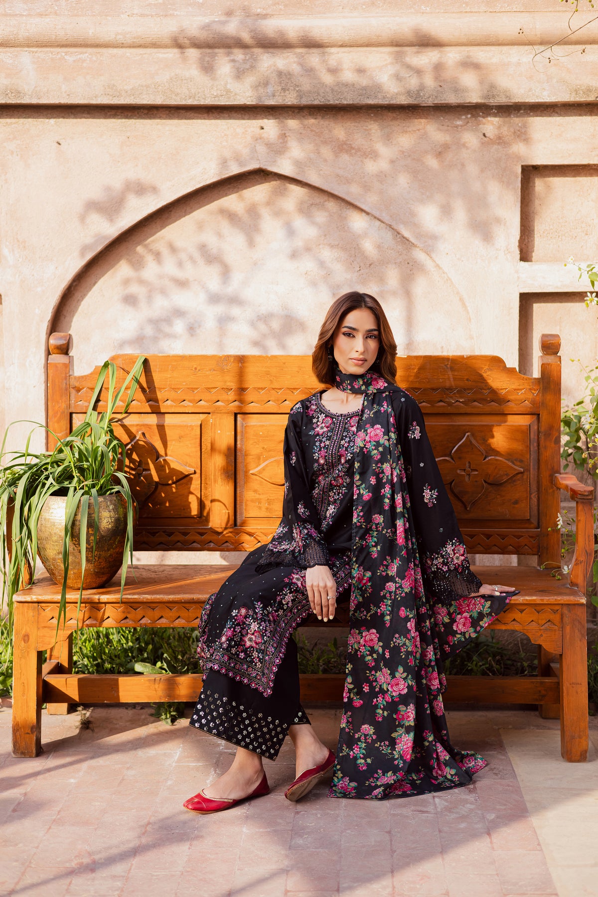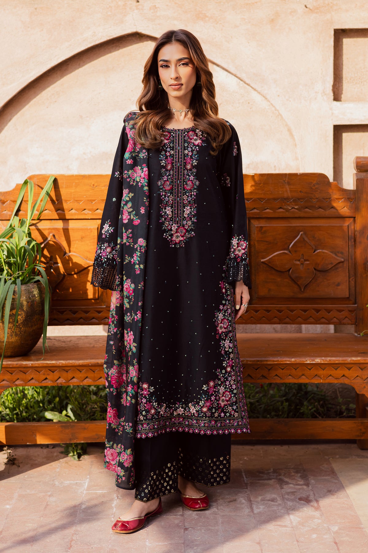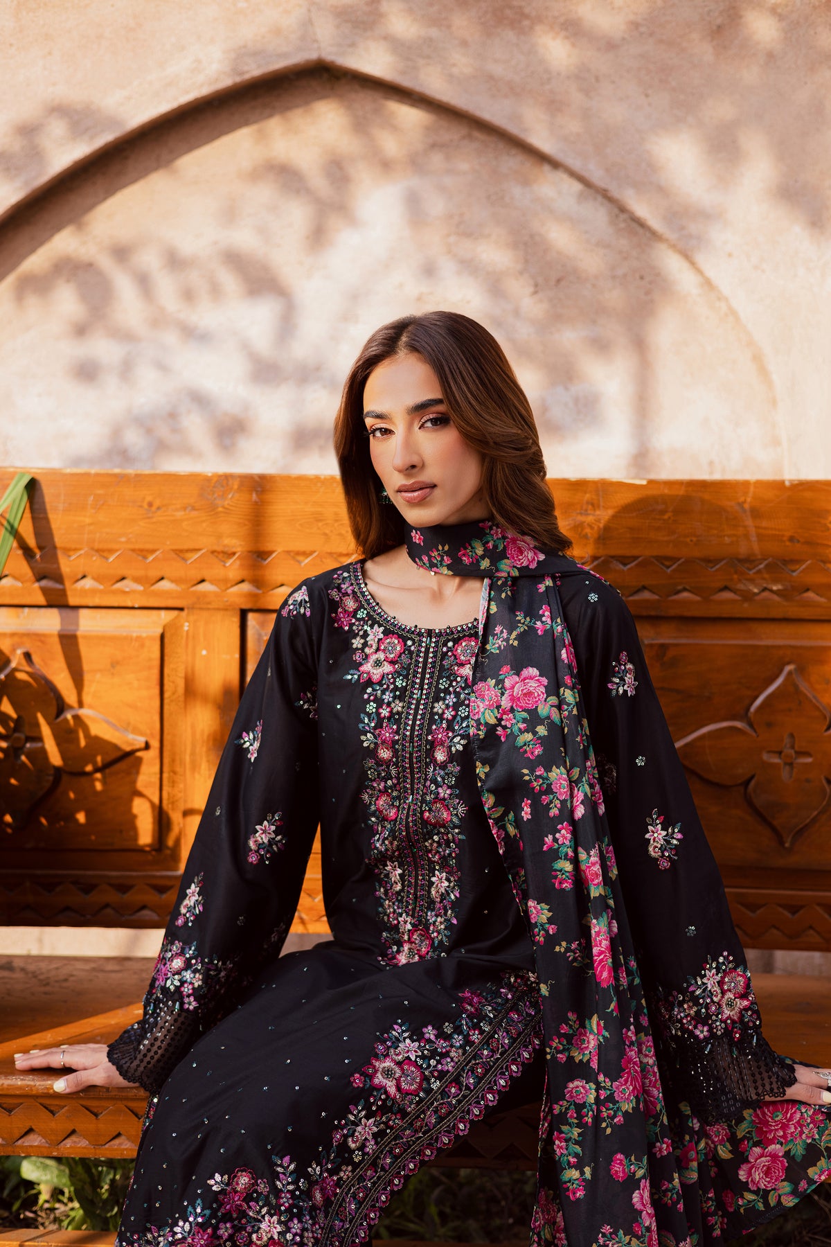 This three-piece ensemble features an elegant black Pima embroidered shirt with sleeves, enhanced with crystal collage detailing along the neckline, shirt hem, and sleeve hems. The luminous accents against the deep black base create a striking and refined festive statement.