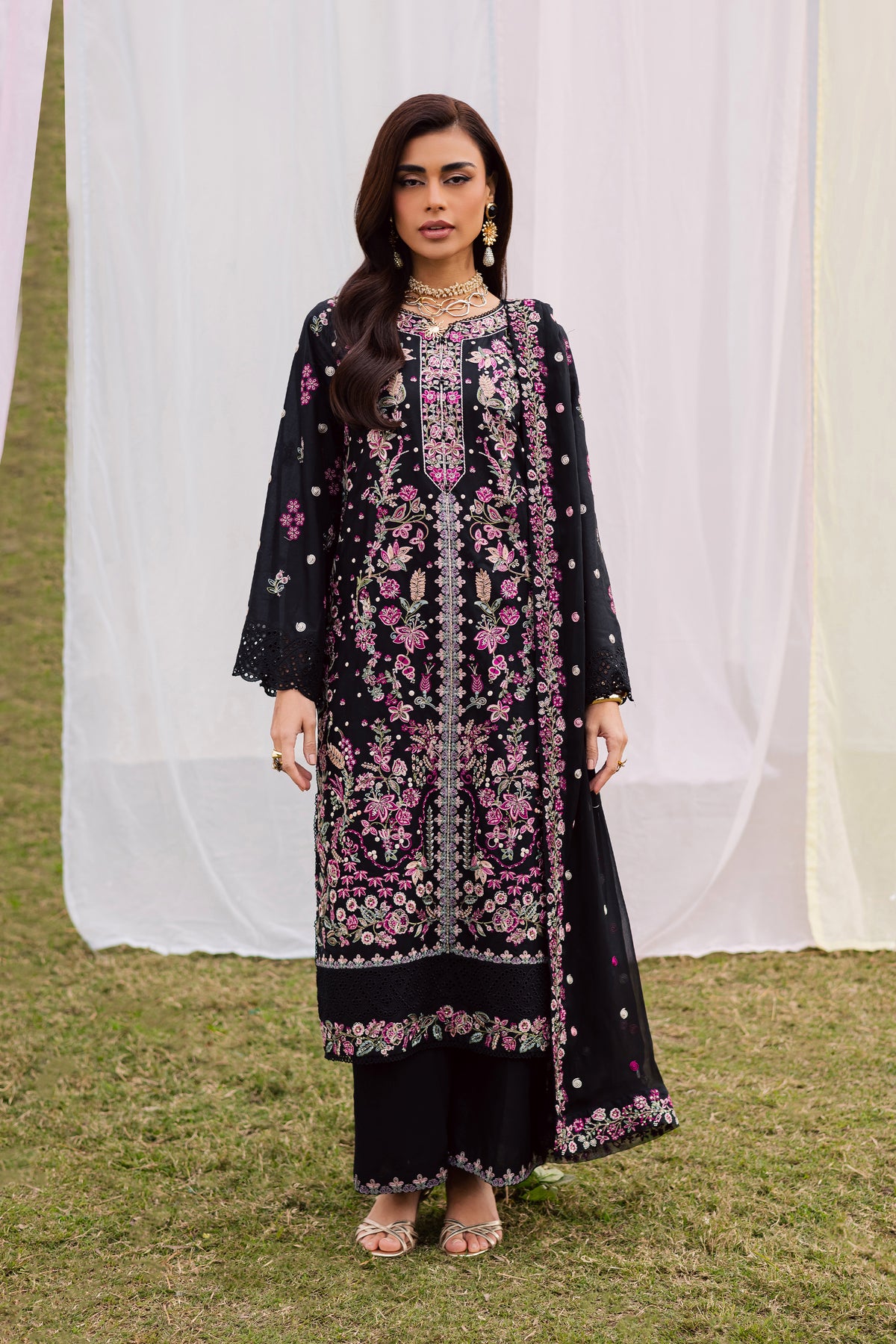 This Pima lawn three-piece Eid outfit features a fully embroidered shirt with sleeves, designed to create an elegant festive statement. The intricate detailing adds depth while preserving the lightness essential for Eid celebrations.