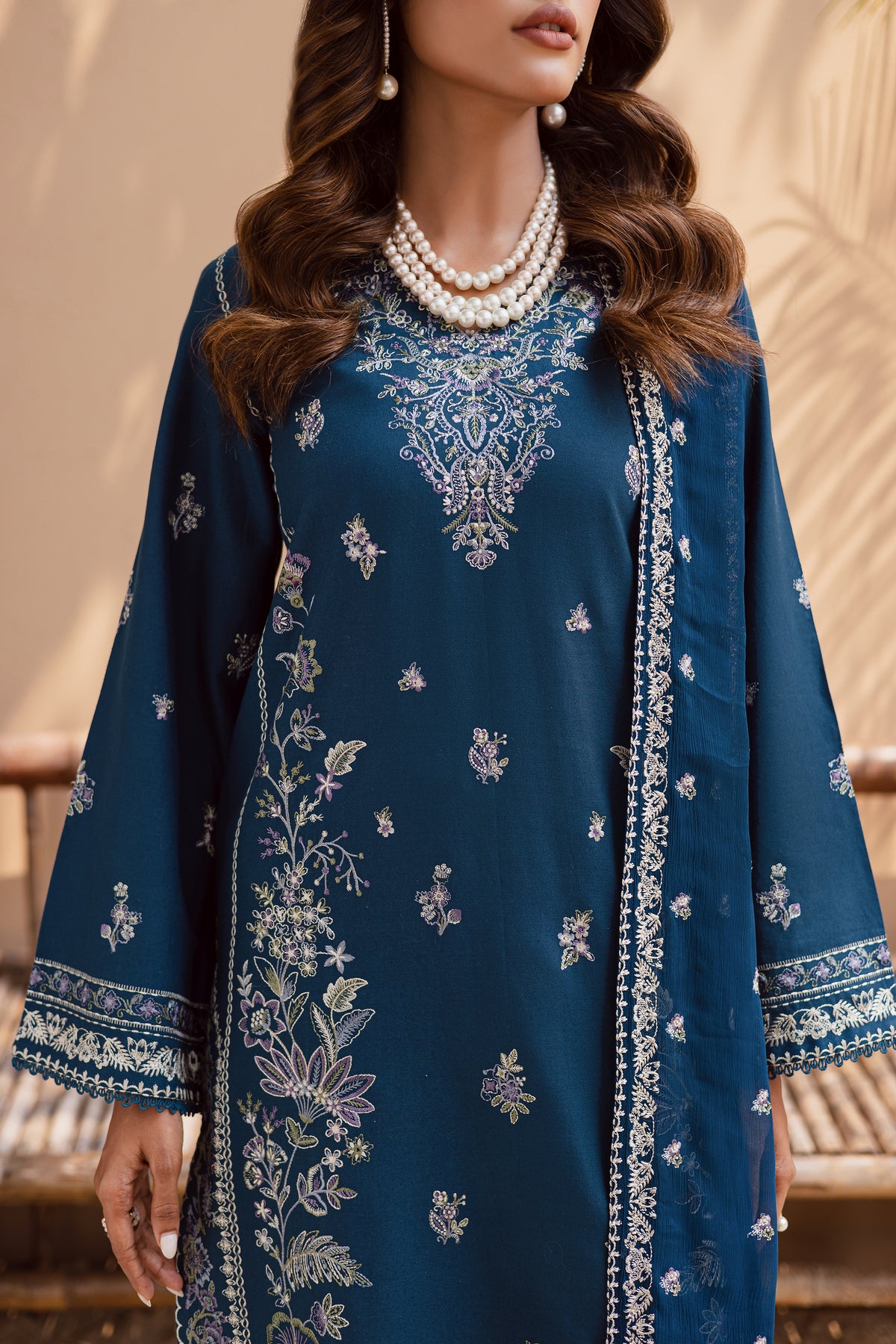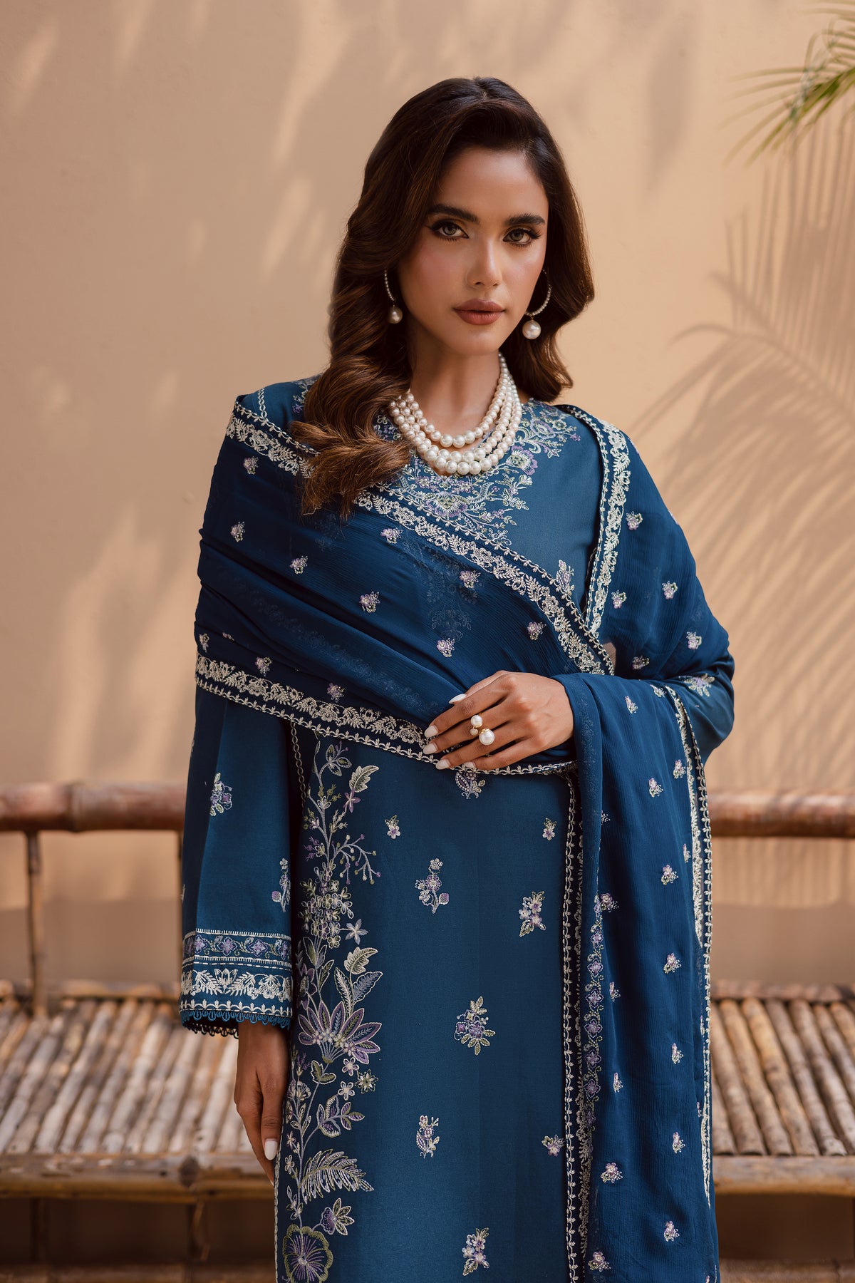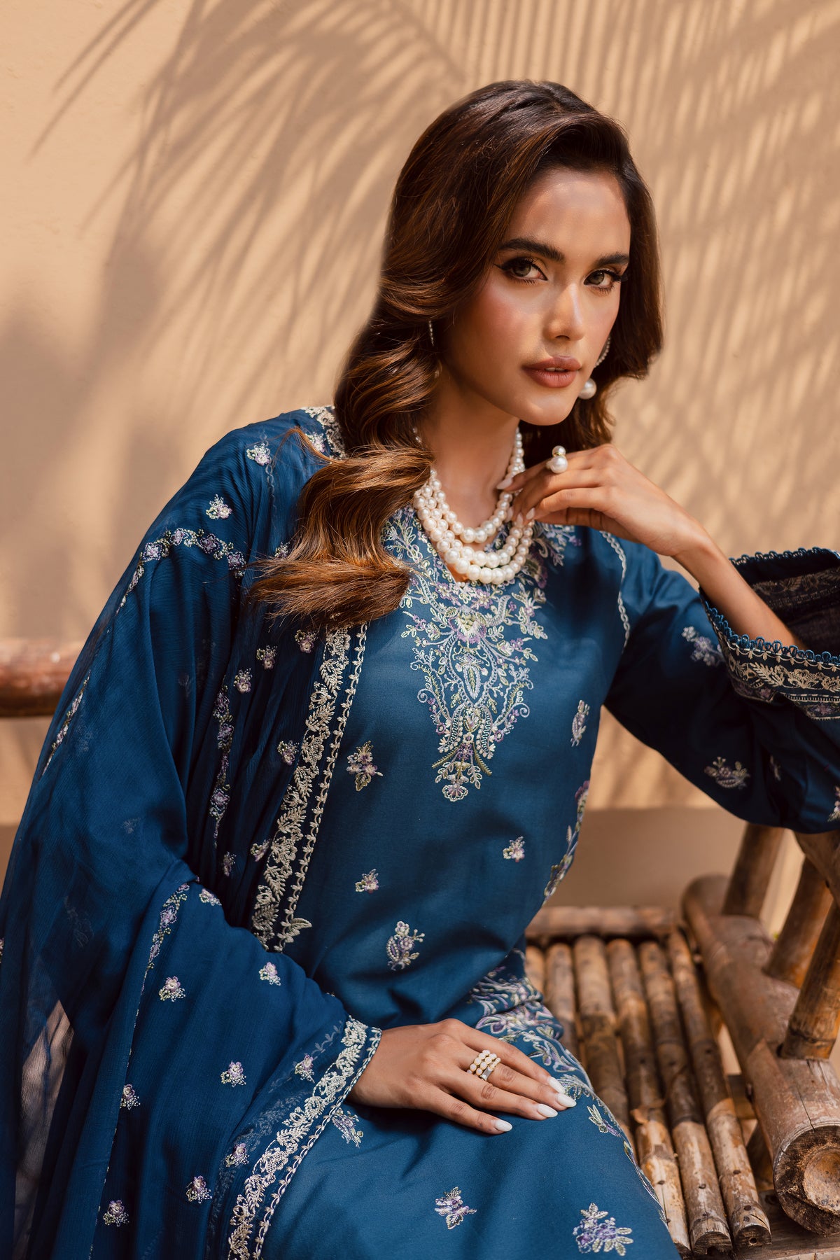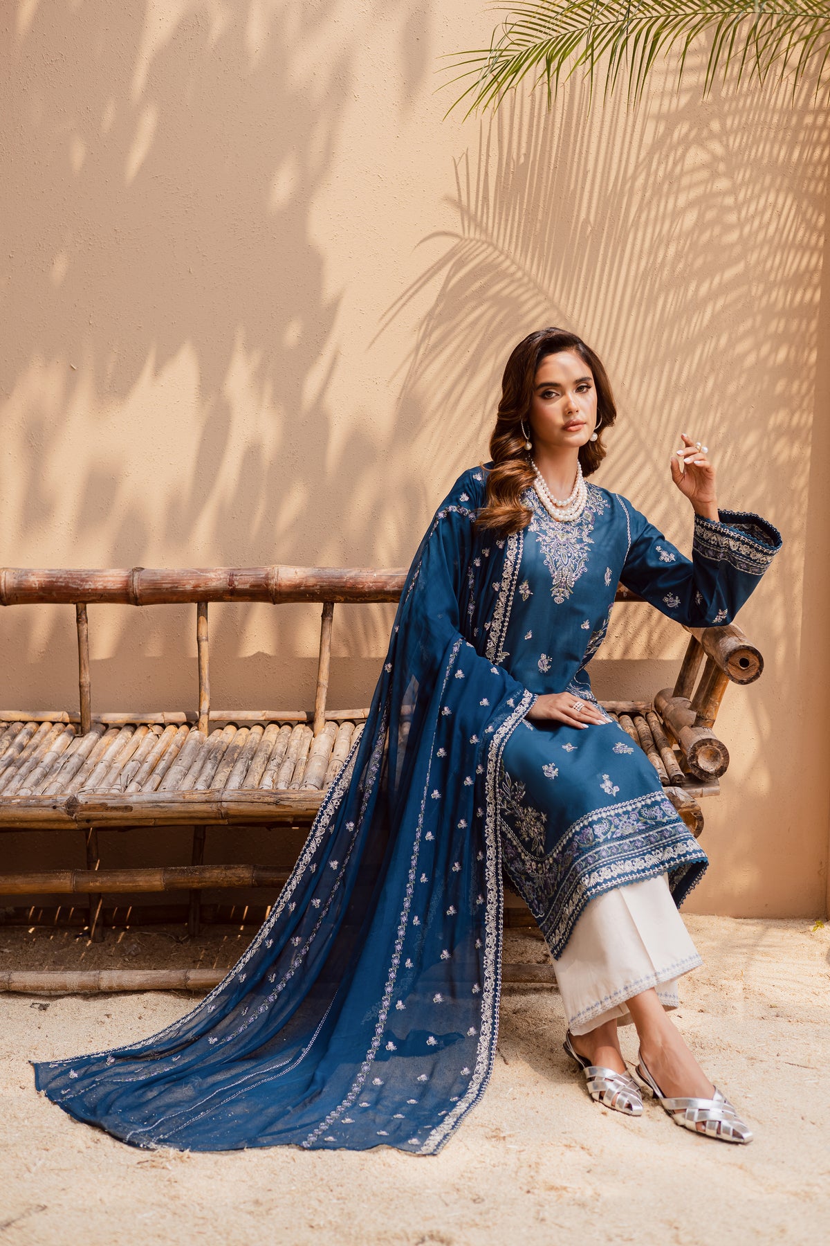This fully embroidered ocean blue straight-cut khaddar shirt showcases delicate threadwork that blends timeless elegance with effortless style. Its refined embroidery makes it an ideal pick for both festive celebrations and graceful daywear.
