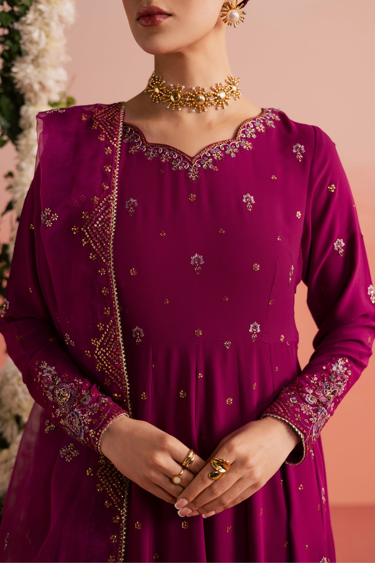 This three-piece georgette ensemble features an embroidered frock with sleeves detailed with an all-over embroidered spread across the front and sleeves. The neckline and sleeve borders are intricately embroidered, while samosa lace finishing along the hem adds a festive handcrafted touch.
