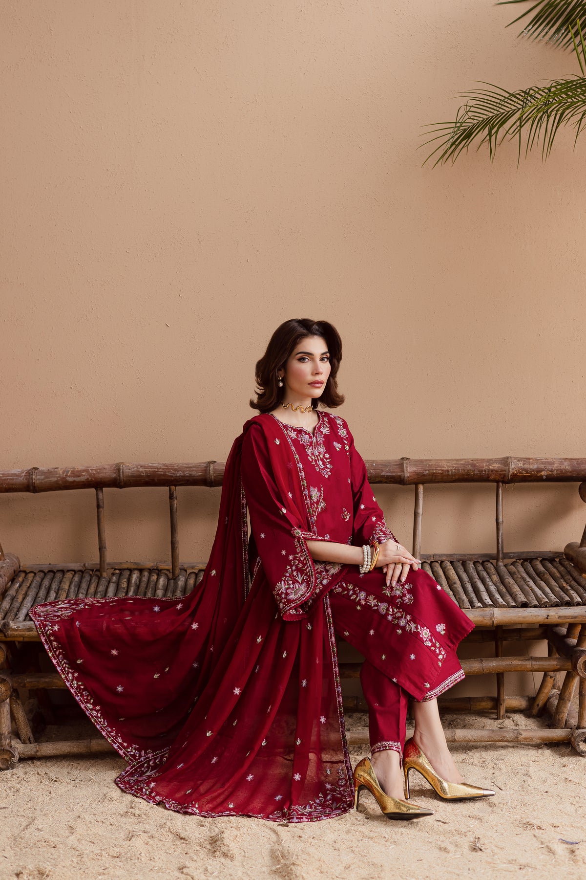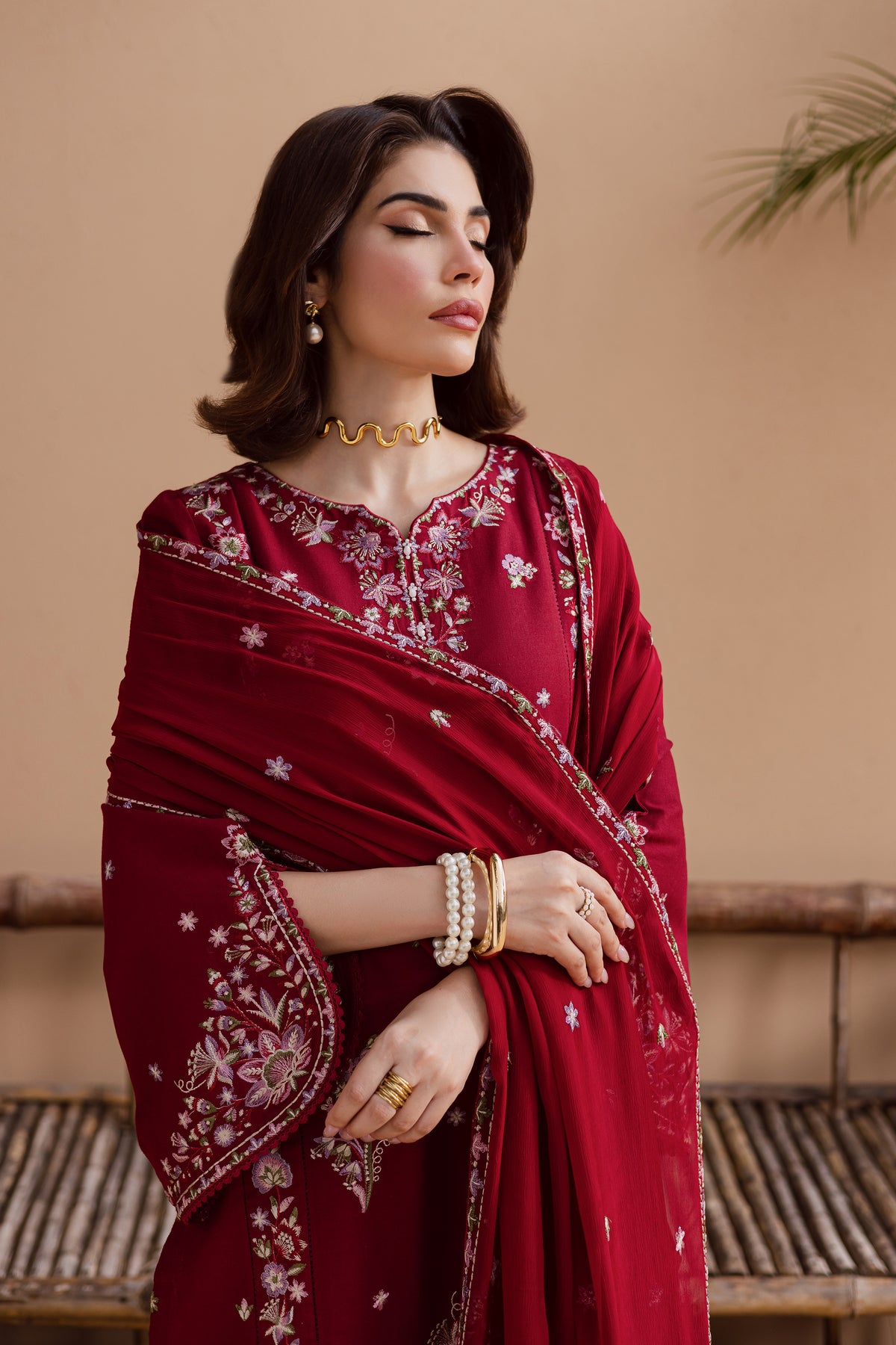 This fully embroidered beetroot khaddar shirt front is complemented with heavily embroidered sleeves, beautifully finished with lace for a refined touch. The intricate detailing adds sophistication, making it perfect for festive occasions and evening gatherings.